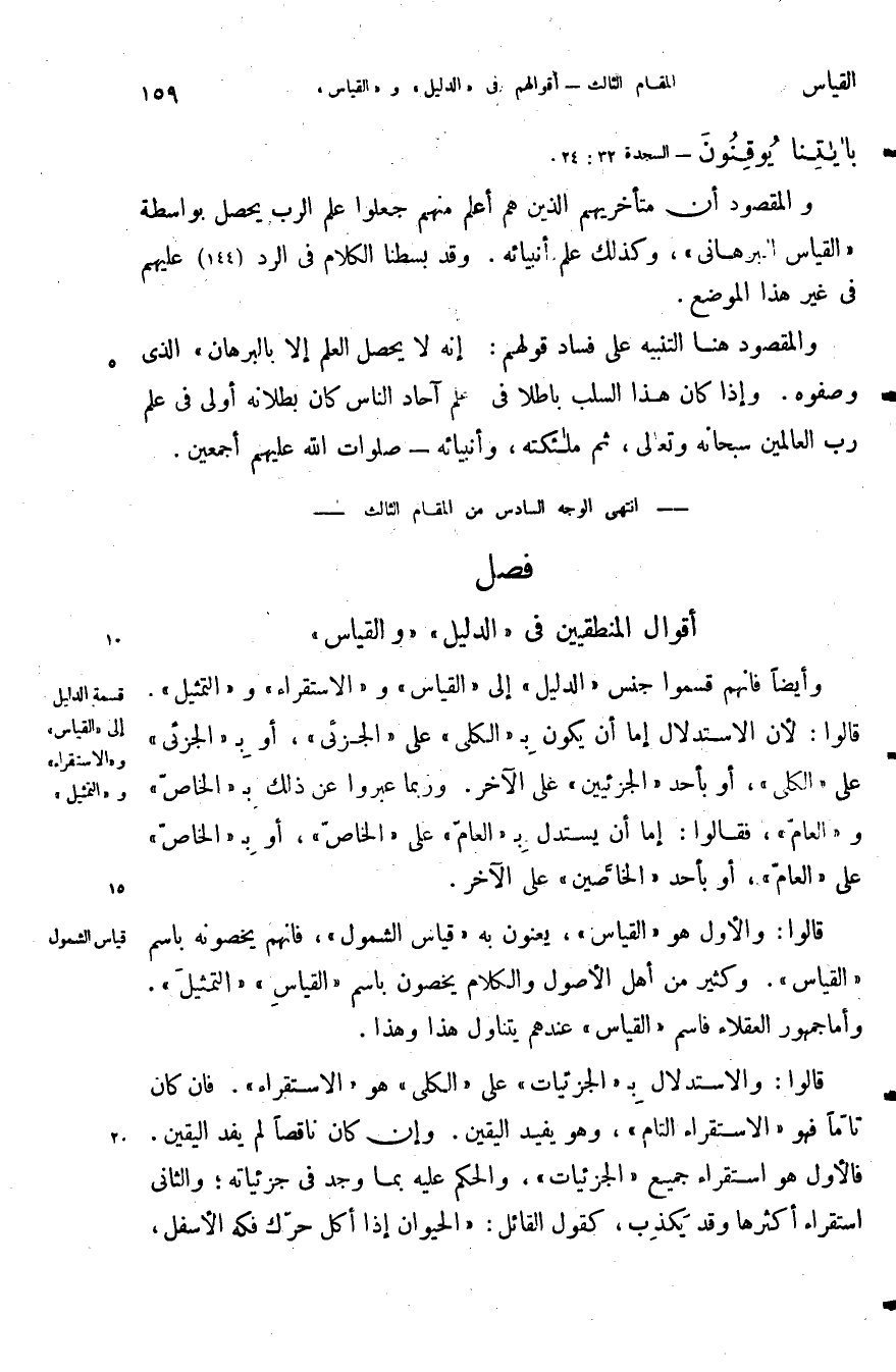 وأيضا فإنهم قسموا جنس الدليل إلى القياس والاستقراء والتمثيل قالوا لأن الاستدلال أما أن يكون ب الكلى على الجزئي أو ب الجزئي على الكلي أو بأحد الجزئين على الآخر وربما عبروا عن ذلك ب الخاص والعام فقالوا أما أن يستدل ب العام على الخاص أو ب الخاص على العام أو بأحد الخاصين على الآخر.