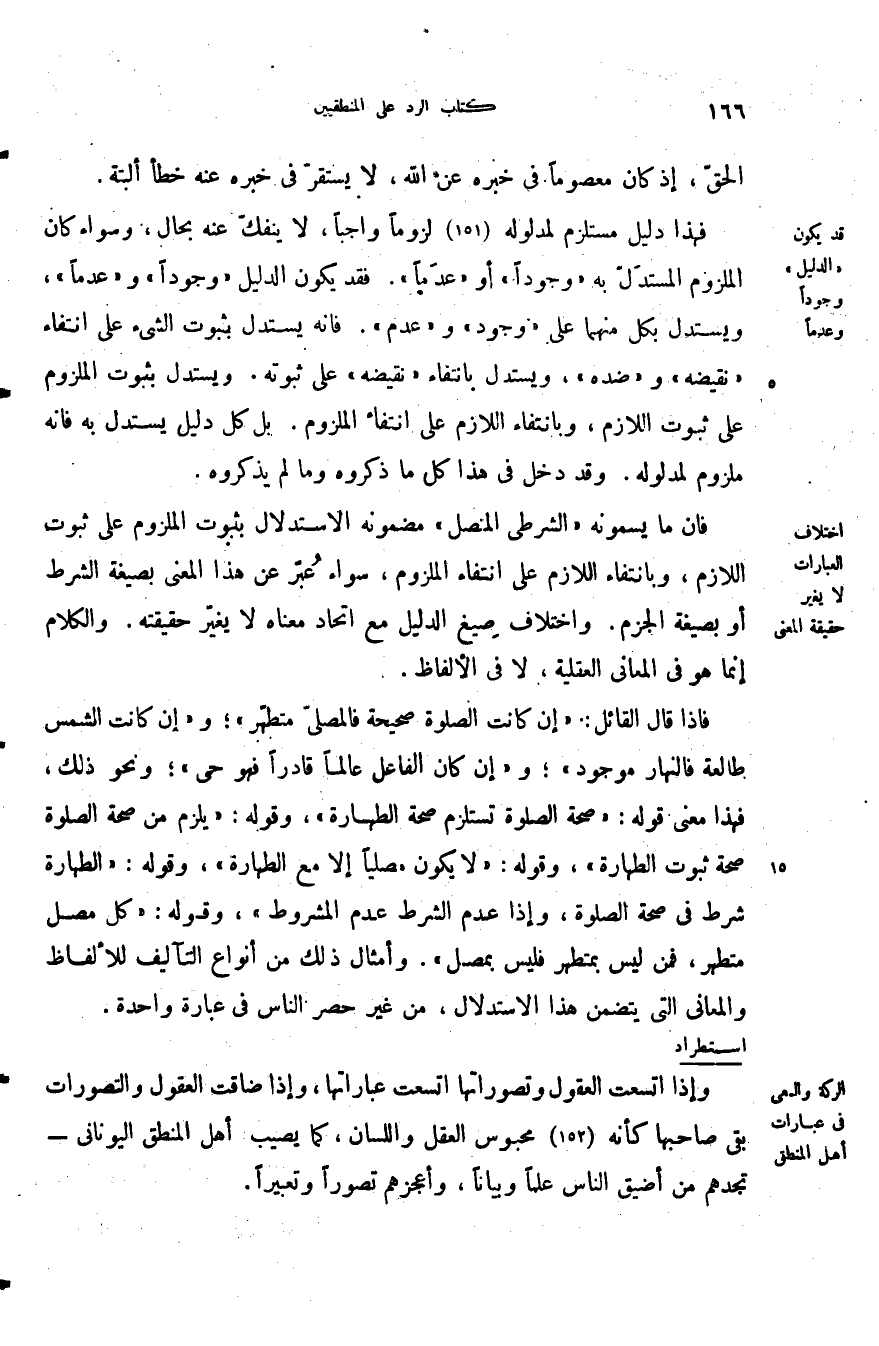 فإذا قال القائل أن كانت الصلاة صحيحة فالمصلى متطهر وإن كانت الشمس طالعة فالنهار موجود وإن كان الفاعل عالما قادرا فهو حي ونحو ذلك فهذا معنى قوله: "صحة الصلاة تستلزم صحة الطهارة" وقوله: "يلزم من صحة الصلاة صحة ثبوت الطهارة" وقوله: "لا يكون مصليا إلا مع الطهارة" وقوله: "الطهارة شرط في صحة الصلاة وإذا عدم الشرط عدم المشروط" وقوله: "كل مصل متطهر فمن ليس بمتطهر فليس بمصل" وأمثال ذلك من أنواع التأليف للألفاظ والمعاني التي يتضمن هذا الاستدلال من غير حصر الناس في عبارة واحدة.
