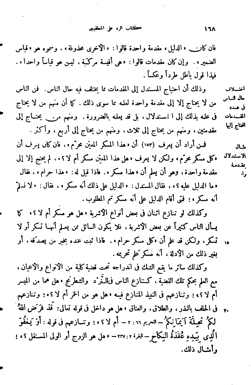 فمن أراد أن يعرف أن هذا المسكر المعين محرم فان كان يعرف أن كل مسكر محرم ولكن لا يعرف هل هذا المعين مسكر أم لا لم يحتج إلا إلى مقدمة واحدة وهو أن يعمل أن هذا مسكر فإذا قيل له هذا حرام فقال ما الدليل عليه فقال المستدل الدليل على ذلك أنه مسكر فقال لا نسلم أنه مسكر فمتى أقام الدليل على أنه مسكر تم المطلوب.