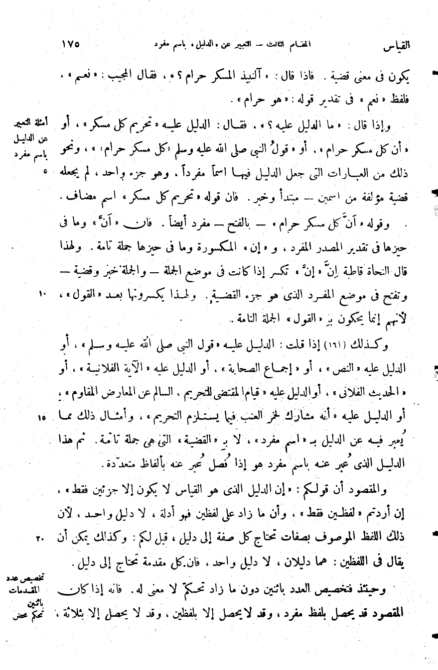 وإذا قال ما الدليل عليه فقال الدليل عليه تحريم كل مسكر أو أن كل مسكر حرام أو قول النبي صلى الله عليه وسلم "كل مسكر حرام" ونحو ذلك من العبارات التي جعل الدليل فيها اسما مفردا وهو جزء واحد لم يجعله قضية مؤلفه من اسمين مبتدأ وخبر فان قوله تحريم كل مسكر اسم مضاف.