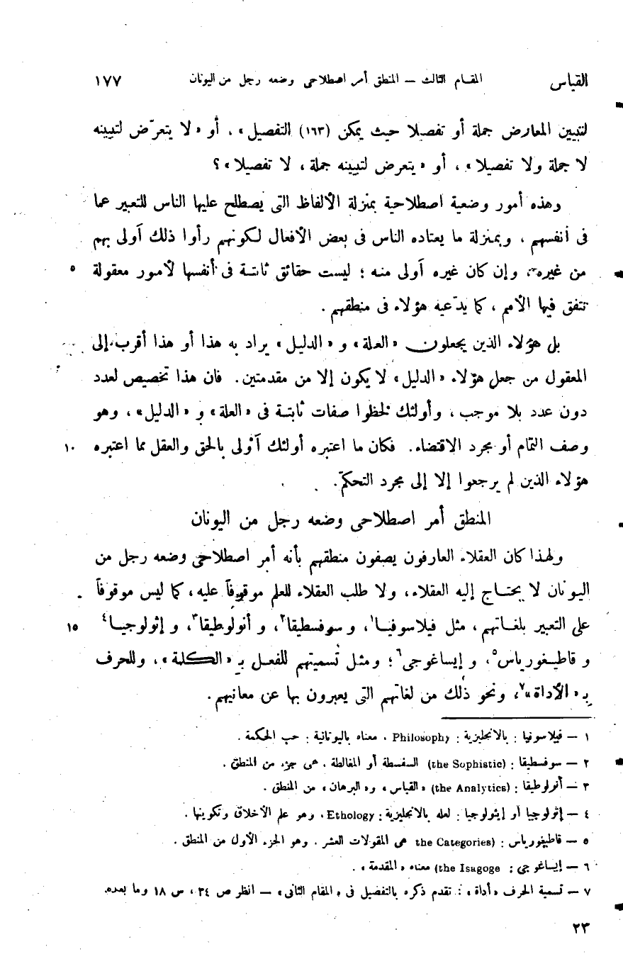 ولهذا كان العقلاء العارفون يصفون منطقهم بأنه أمر اصطلاحي وضعه رجل من اليونان لا يحتاج إليه العقلاء ولا طلب العقلاء للعلم موقوفا عليه كما ليس موقوفا على التعبير بلغاتهم مثل فيلاسوفيا وسوفسطيقا وانولوطيقا وإثولوجيا وقاطيغورياس وإيساغوجى ومثل تسميتهم للفعل ب الكلمة وللحرف ب الأداة ونحو ذلك من لغاتهم التي يعبرون بها عن معانيهم