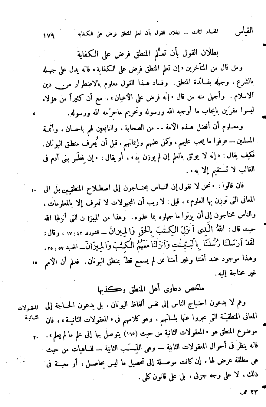 فان قالوا نحن لا نقول أن الناس يحتاجون إلى اصطلاح المنطق بل إلى المعاني التي توزن بها العلوم قيل لا ريب أن المجهولات لا تعرف إلا بالمعلومات والناس يحتاجون إلى أن يزنوا ما جهلوه بما علموه وهذا من الموازين التي انزلها الله حيث قال الله: {اللَّهُ الَّذِي أَنْزَلَ الْكِتَابَ بِالْحَقِّ وَالْمِيزَانَ} وقال: {لَقَدْ أَرْسَلْنَا رُسُلَنَا بِالْبَيِّنَاتِ وَأَنْزَلْنَا مَعَهُمُ الْكِتَابَ وَالْمِيزَانَ} وهذا موجود عند أمتنا وغير أمتنا ممن لم يسمع قط بمنطق اليونان فعلم أن الأمم غير محتاجة إليه.