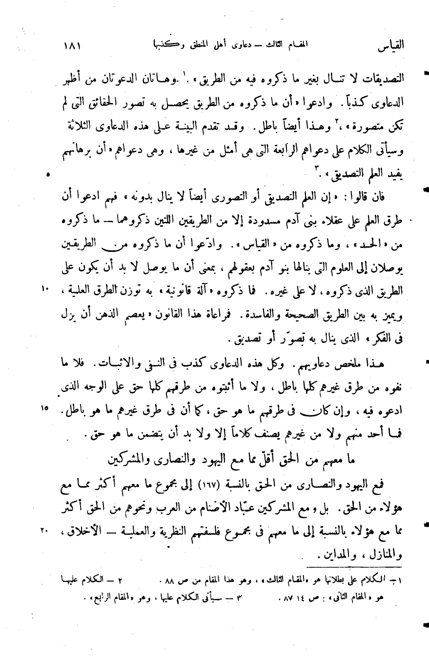 فان قالوا أن العلم التصديقي أو التصوري أيضا لا ينال بدونه فهم ادعوا أن طرق العلم على عقلاء بني آدم مسدودة إلا من الطريقين اللتين ذكروهما ما ذكروه من الحد وما ذكروه من القياس وادعوا أن ما ذكروه من الطريقين يوصلان إلى العلوم التي ينالها بنو آدم بعقولهم بمعنى أن ما يوصل لا بد أن يكون على الطريق الذي ذكروه لا على غيره فما ذكروه آلة قانونية به توزن الطرق العلمية ويميز به بين الطريق الصحيحة والفاسدة فمراعاة هذا القانون يعصم الذهن أن يزل في الفكر الذي ينال به تصور أو تصديق.