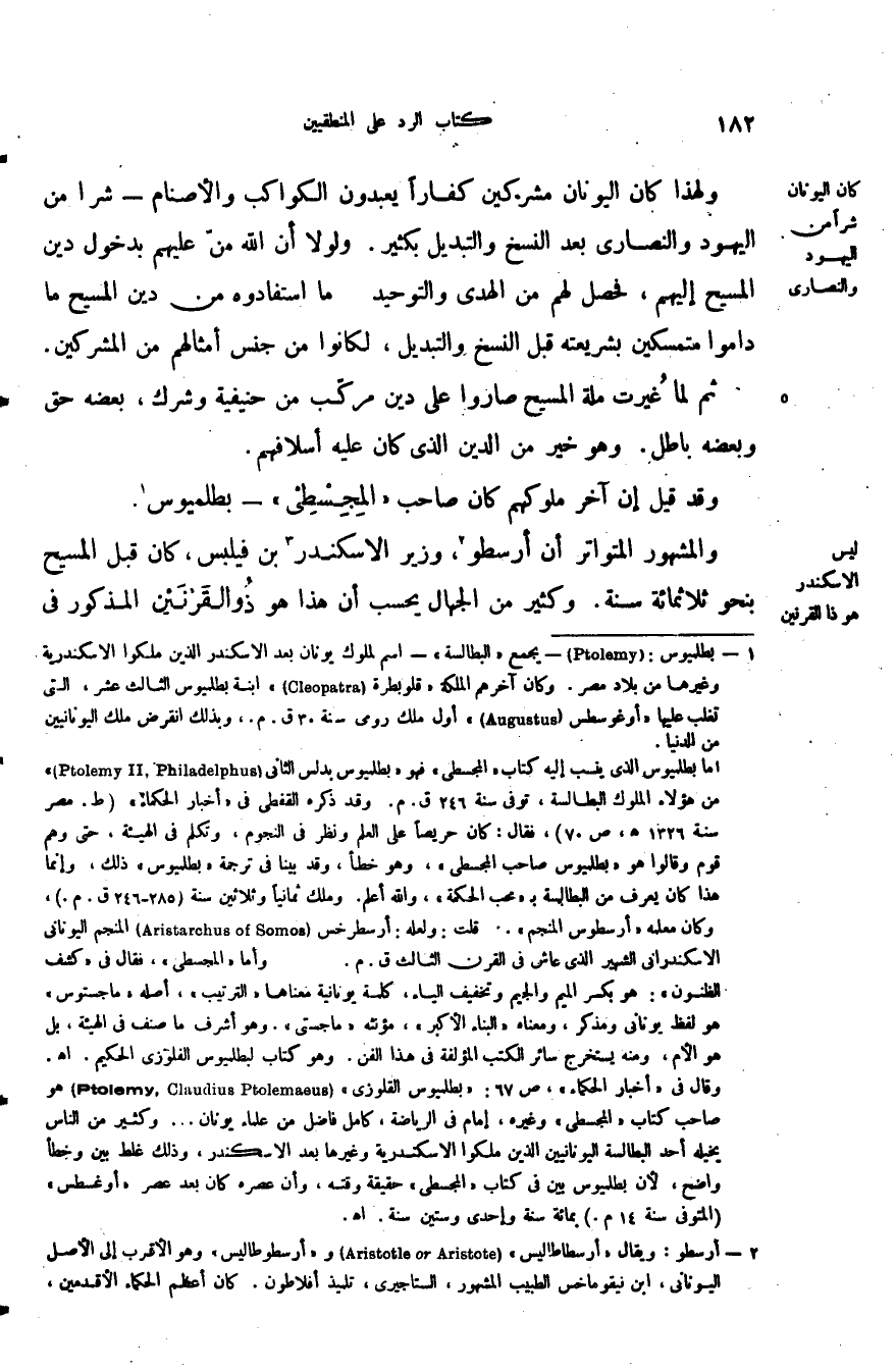 ولهذا كان اليونان مشركين كفارا يعبدون الكواكب والأصنام شرا من اليهود والنصارى بعد النسخ والتبديل بكثير ولولا أن الله من عليهم بدخول دين المسيح إليهم فحصل لهم من الهدى والتوحيد وما استفادوه من دين المسيح ما داموا متمسكين بشريعته قبل النسخ والتبديل لكانوا من جنس أمثالهم من المشركين.