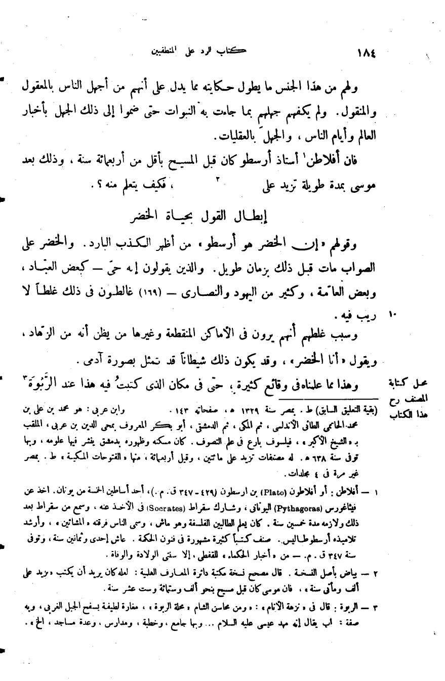 وقولهم أن الخضر هو أرسطو من اظهر الكذب البارد والخضر على الصواب مات قبل ذلك بزمان طويل والذين يقولون أنه حي كبعض العباد وبعض العامة وكثير من اليهود والنصارى غالطون في ذلك غلطا لا ريب فيه.