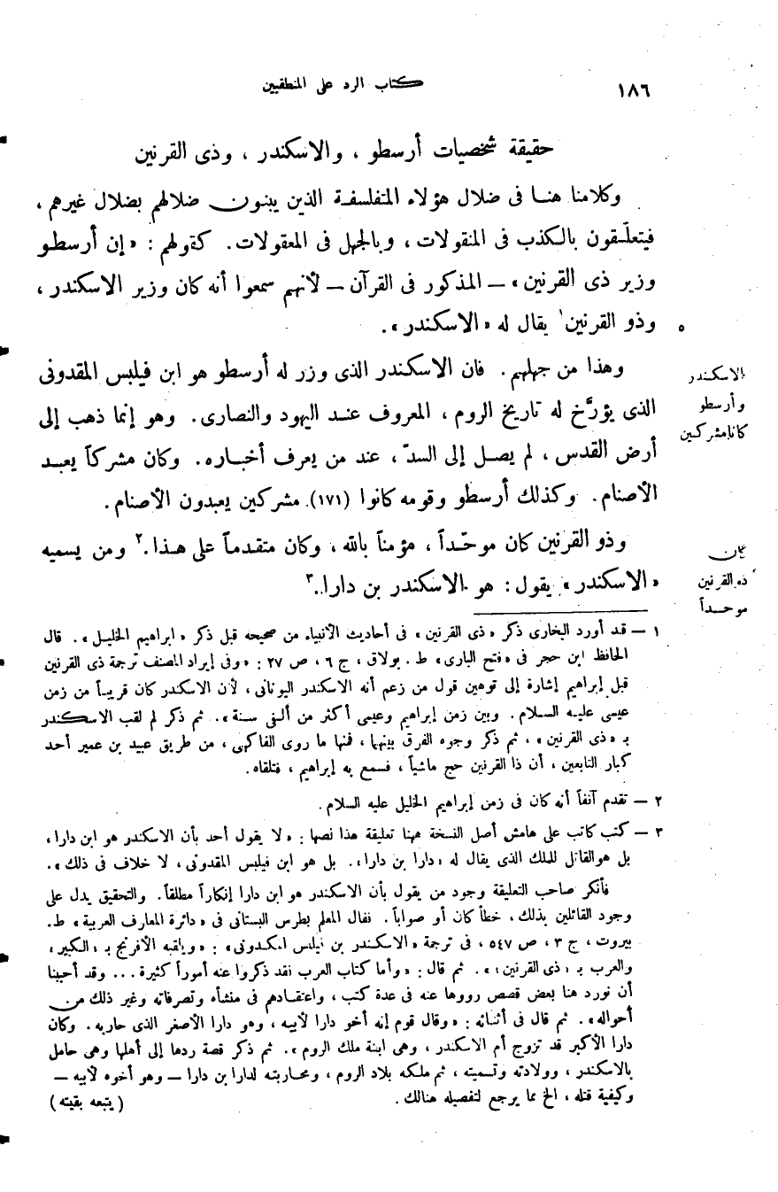 وكلامنا هنا في ضلال هؤلاء المتفلسفة الذين يبنون ضلالهم بضلال غيرهم فيتعلقون بالكذب في المنقولات وبالجهل في المعقولات كقولهم أن أرسطو وزير ذي القرنين المذكور في القرآن لأنهم سمعوا أنه كان وزير الاسكندر وذو القرنين يقال له الاسكندر.