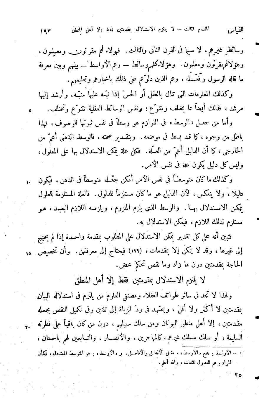 ولهذا لا تجد في سائر طوائف العقلاء ومصنفي العلوم من يلتزم في استدلاله البيان بمقدمتين لا أكثر ولا أقل ويجتهد في رد الزيادة إلى ثنتين وفي تكميل النقص بجعله مقدمتين إلا أهل منطق اليونان ومن سلك سبيلهم دون من كان باقيا على فطرته السليمة أو سلك مسلك غيرهم كالمهاجرين والأنصار والتابعين لهم بإحسان