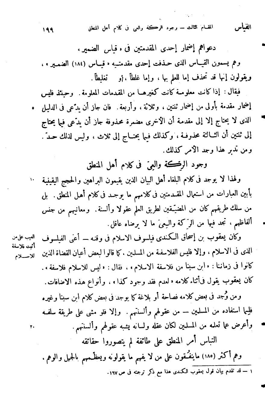 وكان يعقوب بن إسحاق الكندي فيلسوف الإسلام في وقته أعنى الفيلسوف الذي في الإسلام وإلا فليس الفلاسفة من المسلمين كما قالوا لبعض أعيان القضاة الذين كانوا في زماننا ابن سينا من فلاسفة الإسلام فقال ليس للإسلام فلاسفة كان يعقوب يقول في أثناء كلامه لعدم فقد وجود كذا وأنواع هذه الإضافات.