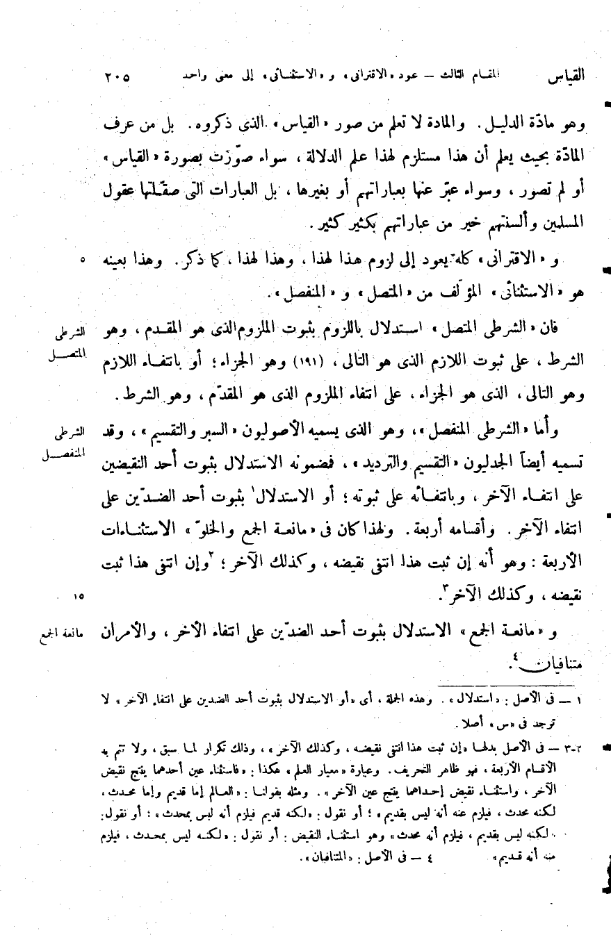 وأما الشرطي المنفصل وهو الذي يسميه الأصوليون السبر والتقسيم وقد تسميه أيضا الجدليون التقسيم والترديد فمضمونه الاستدلال بثبوت احد النقضين على انتفاء الآخر وبانتفائه على ثبوته أو الاستدلال بثبوت أحد الضدين على انتفاء الآخر وأقسامه أربعة ولهذا كان في مانعة الجمع والخلو الاستثناءات الأربعة وهو أنه أن ثبت هذا انتفى نقيضه وكذلك الآخر وإن انتفى هذا ثبت نقيضه وكذلك الآخر.