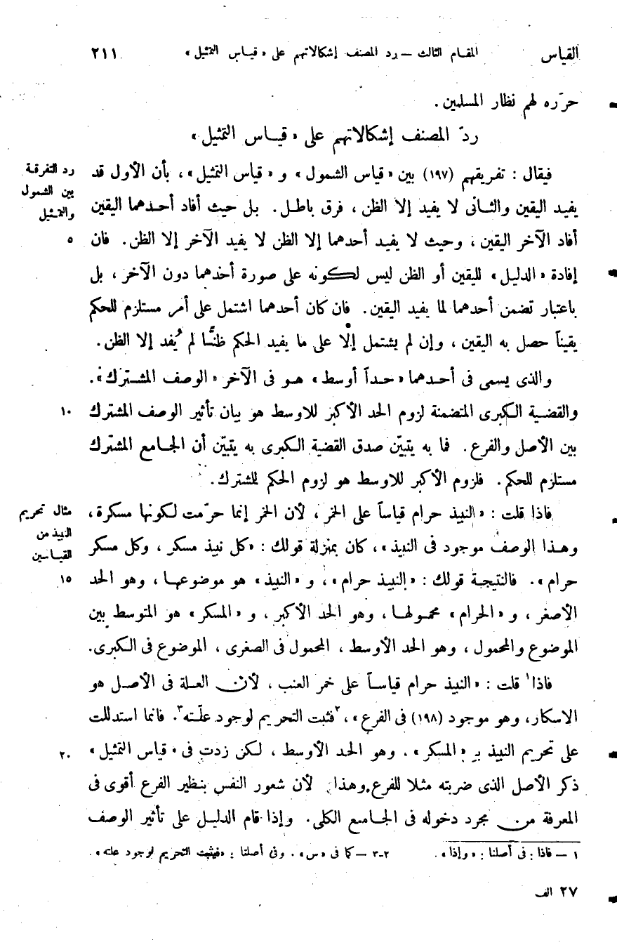 فإذا قلت النبيذ حرام قياسا على خمر العنب لأن العلة في الأصل هو الإسكار وهو موجود في الفرع فثبت التحريم لوجود علته فإنما استدللت على تحريم النبيذ ب المسكر وهو الحد الأوسط لكن زدت في قياس التمثيل ذكر الأصل الذي ضربته مثلا للفرع وهذا لأن شعور النفس بنظير الفرع أقوى في المعرفة من مجرد دخوله في الجامع الكلي وإذا قام الدليل على تأثير الوصف