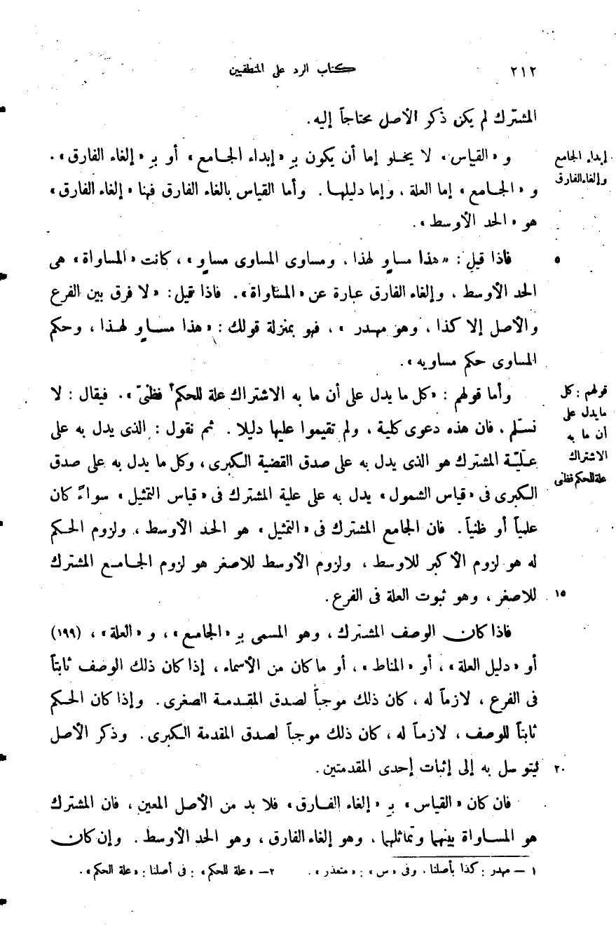 وأما قولهم كل ما يدل على أن ما به الاشتراك علة للحكم فظني فيقال لا نسلم فان هذه دعوى كلية ولم تقيموا عليها دليلا ثم نقول الذي يدل به على عليه المشترك هو الذي يدل به على صدق القضية الكبرى وكل ما يدل به على صدق الكبرى في قياس الشمول يدل به على علية المشترك في قياس الثمثيل سواء كان علميا أو ظنيا فان الجامع المشترك في التمثيل هو الحد الأوسط ولزوم الحكم له هو لزوم الأكبر للأوسط ولزوم الأوسط للأصغر هو لزوم الجامع المشترك للأصغر وهو ثبوت العلة في الفرع.