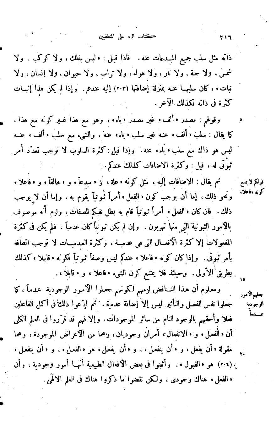 ومعلوم أن هذا التناقض لزمهم لكونهم جعلوا الأمور الوجودية عدما كما جعلوا نفس الفعل والتأثير ليس إلا إضافة عدمية ثم ادعوا ذلك في أكمل الفاعلين فعلا وأحقهم بالوجود التام من سائر الموجودات وإلا فهم قد قرروا في العلم الكلى أن الفعل والانفعال أمران وجوديان وهما من الأعراض الموجودة وهما مقولة أن يفعل وأن ينفعل وأن يفعل هو الفعل وأن ينفعل هو القبول وأثبتوا في بعض الأفعال الطبيعية أنها أمور وجودية وأن الفعل هناك وجودي ولكن نقضوا ما ذكروا هناك في العلم الإلهي