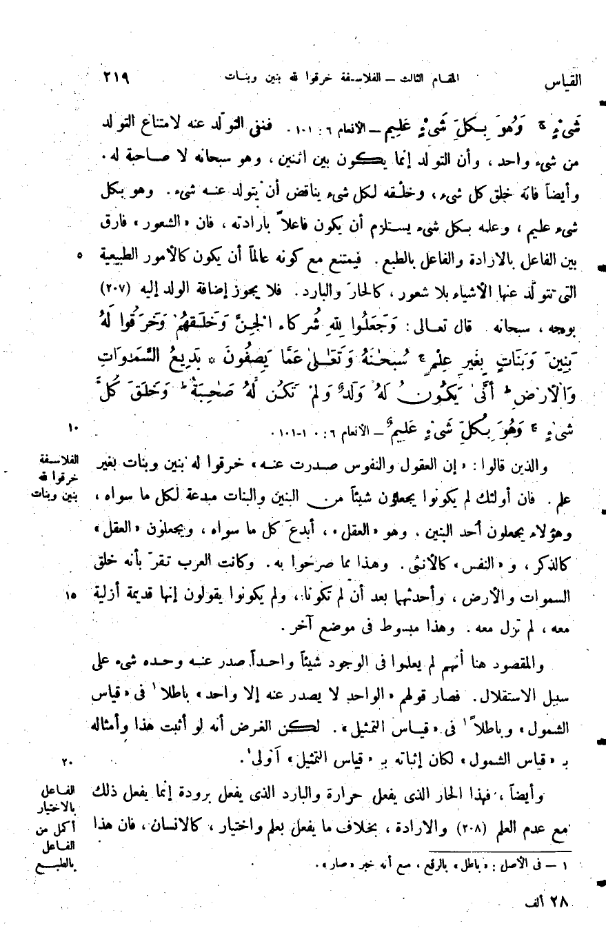 والذين قالوا أن العقول والنفوس صدرت عنه خرقوا له بنين وبنات بغير علم فان أولئك لم يكونوا يجعلون شيئا من البنين والبنات مبدعة لكل ما سواه وهؤلاء يجعلون احد البنين وهو العقل أبدع كل ما سواه ويجعلون العقل كالذكر والنفس كالأنثى وهذا مما صرحوا به وكانت العرب تقر بأنه خلق السموات والأرض وأحدثهما بعد أن لم تكونا ولم يكونوا يقولون أنها قديمة أزلية معه لم تزل معه وهذا مبسوط في موضع آخر.
