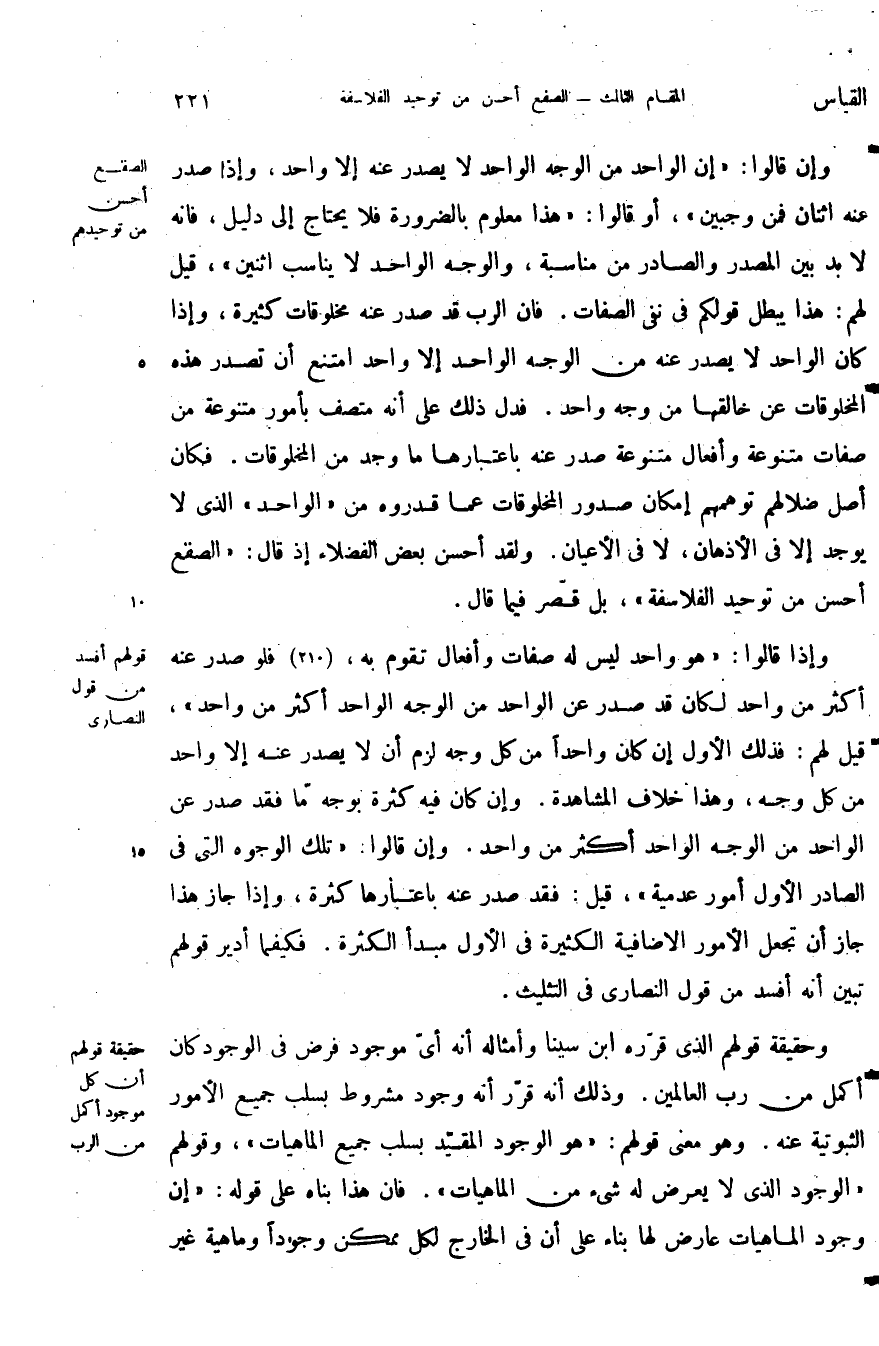 وإذا قالوا هو واحد ليس له صفات وأفعال تقوم به فلو صدر عنه أكثر من واحد لكان قد صدر عن الواحد من الوجه الواحد أكثر من واحد قيل لهم فذلك الأول أن كان واحدا من كل وجه لزم أن لا يصدر عنه إلا واحد من كل وجه وهذا خلاف المشاهدة وان كان فيه كثرة بوجه ما فقد صدر عن الواحد من الوجه الواحد أكثر من واحد وان قالوا تلك الوجوه التي في الصادر الأول أمور عدمية قيل فقد صدر عنه باعتبارها كثرة وإذا جاز هذا جاز أن تجعل الأمور الإضافية الكثيرة في الأول مبدأ الكثرة فكيفما أدير قولهم تبين أنه افسد من قول النصارى في التثليث.