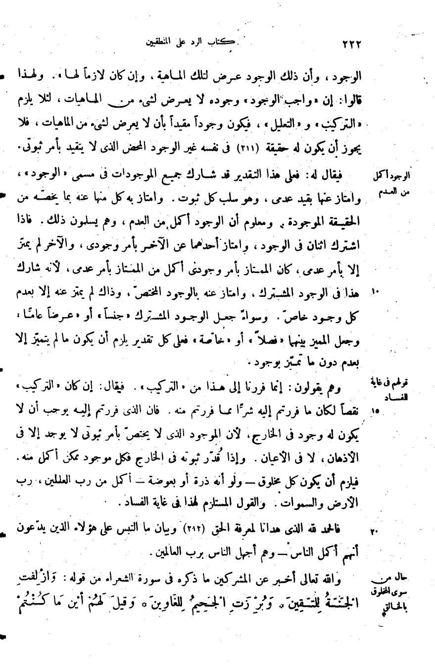 وهم يقولون إنما فررنا إلى هذا من التركيب فيقال أن كان التركيب نقصا لكان ما فررتم إليه شرا مما فررتم منه فان الذي فررتم إليه يوجب أن لا يكون له وجود في الخارج لأن الموجود الذي لا يختص بأمر ثبوتي لا يوجد إلا في الأذهان لا في الأعيان وإذا قدر ثبوته في الخارج فكل موجود ممكن أكمل منه فيلزم أن يكون كل مخلوق ولو أنه ذرة أو بعوضة أكمل من رب العالمين رب الأرض السموات والقول المستلزم هذا في غاية الفساد.