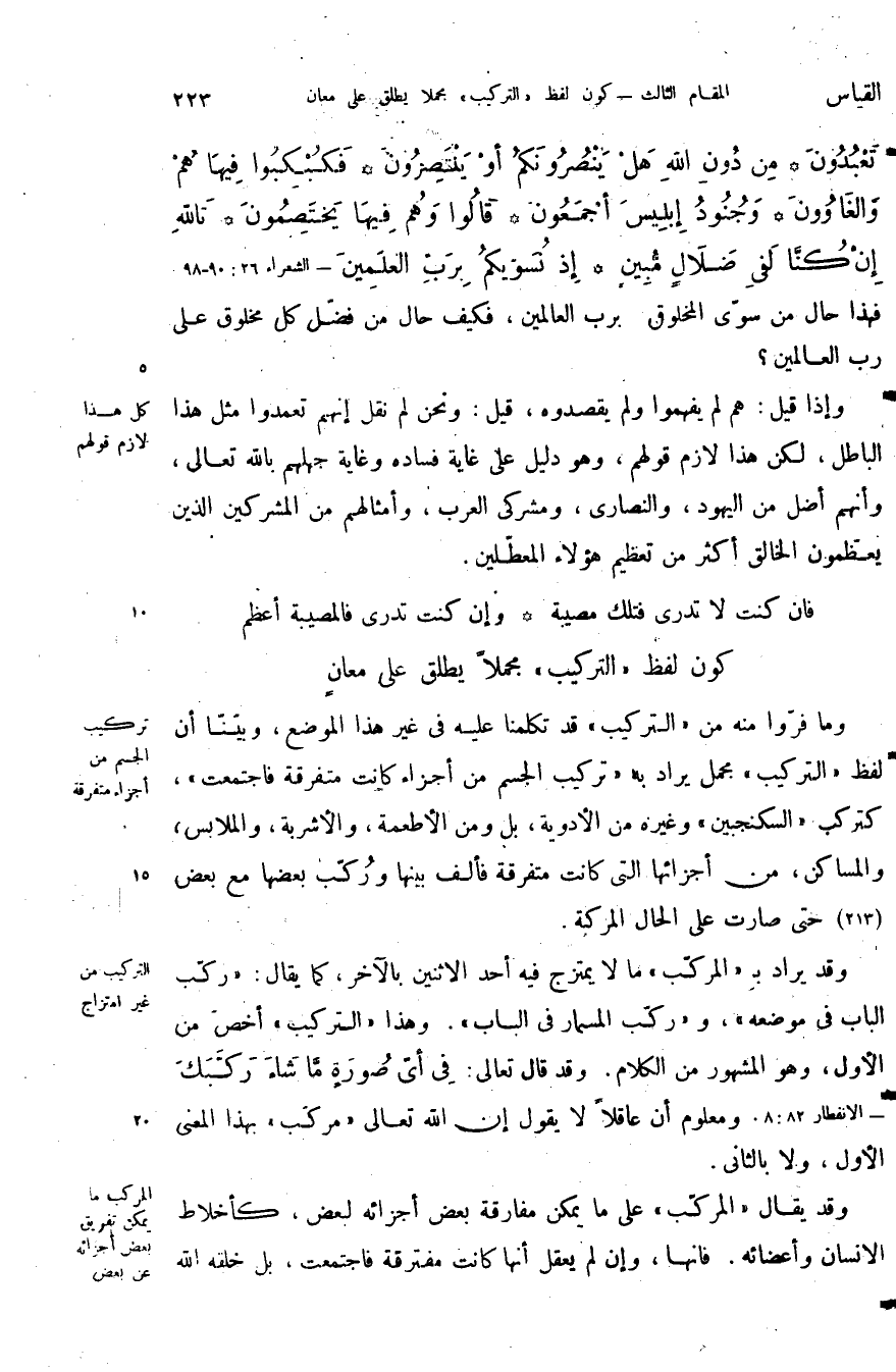وقد يراد ب المركب ما لا يمتزج فيه احد الاثنين بالآخر كما يقال ركب الباب في موضعه وركب المسمار في الباب وهذا التركيب اخص من الأول وهو المشهور من الكلام وقد قال تعالى: {فِي أَيِّ صُورَةٍ مَا شَاءَ رَكَّبَكَ} ومعلوم أن عاقلا لا يقول أن الله تعالى مركب بهذا المعنى الأول ولا بالثاني.