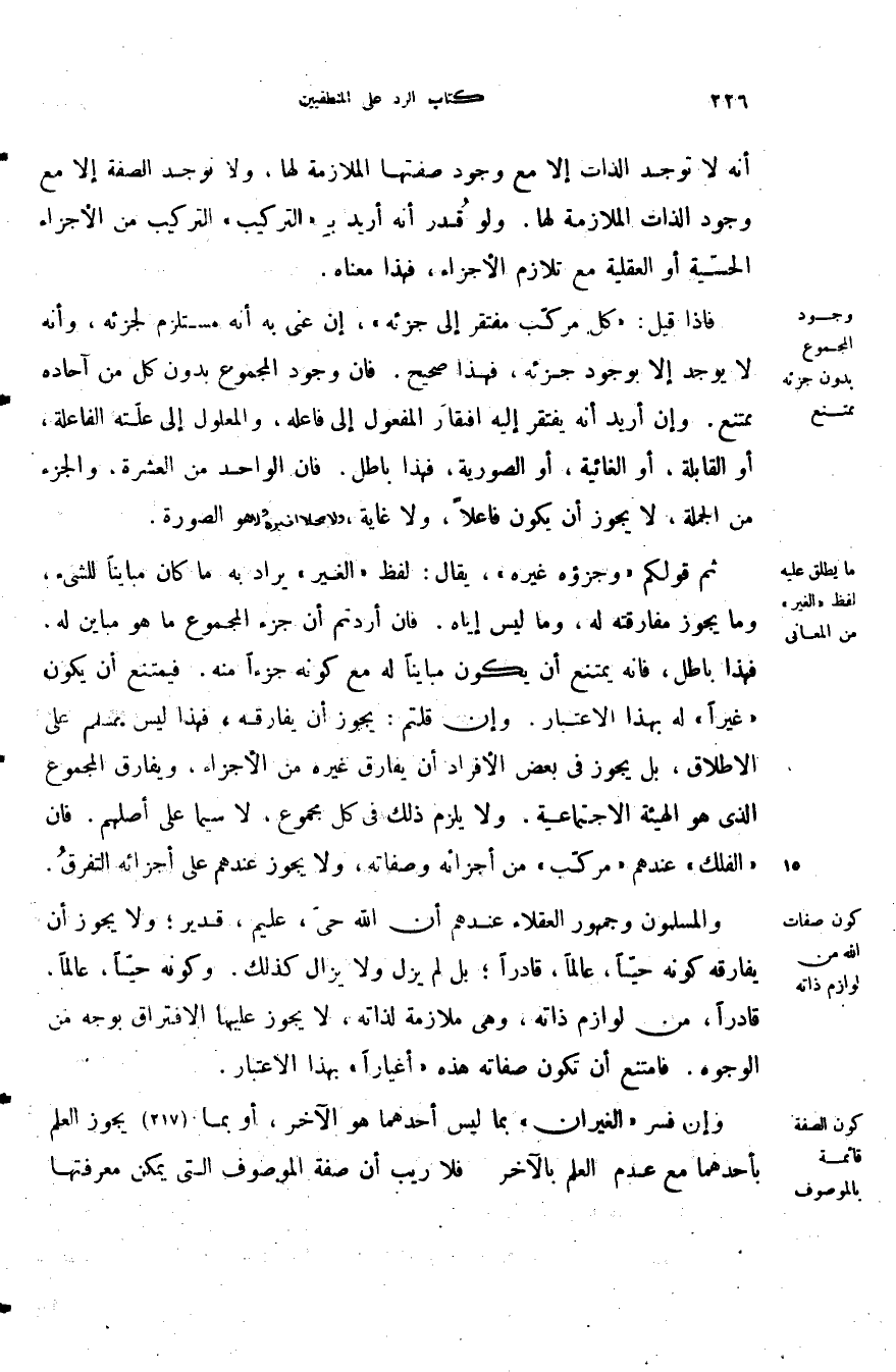 انه لا توجد الذات إلا مع وجود صفتها الملازمة لها ولا توجد الصفة إلا مع وجود الذات الملازمة لها ولو قدر أنه أريد بالتركيب التركيب من الأجزاء الحسية أو العقلية مع تلازم الأجزاء فهذا معناه.