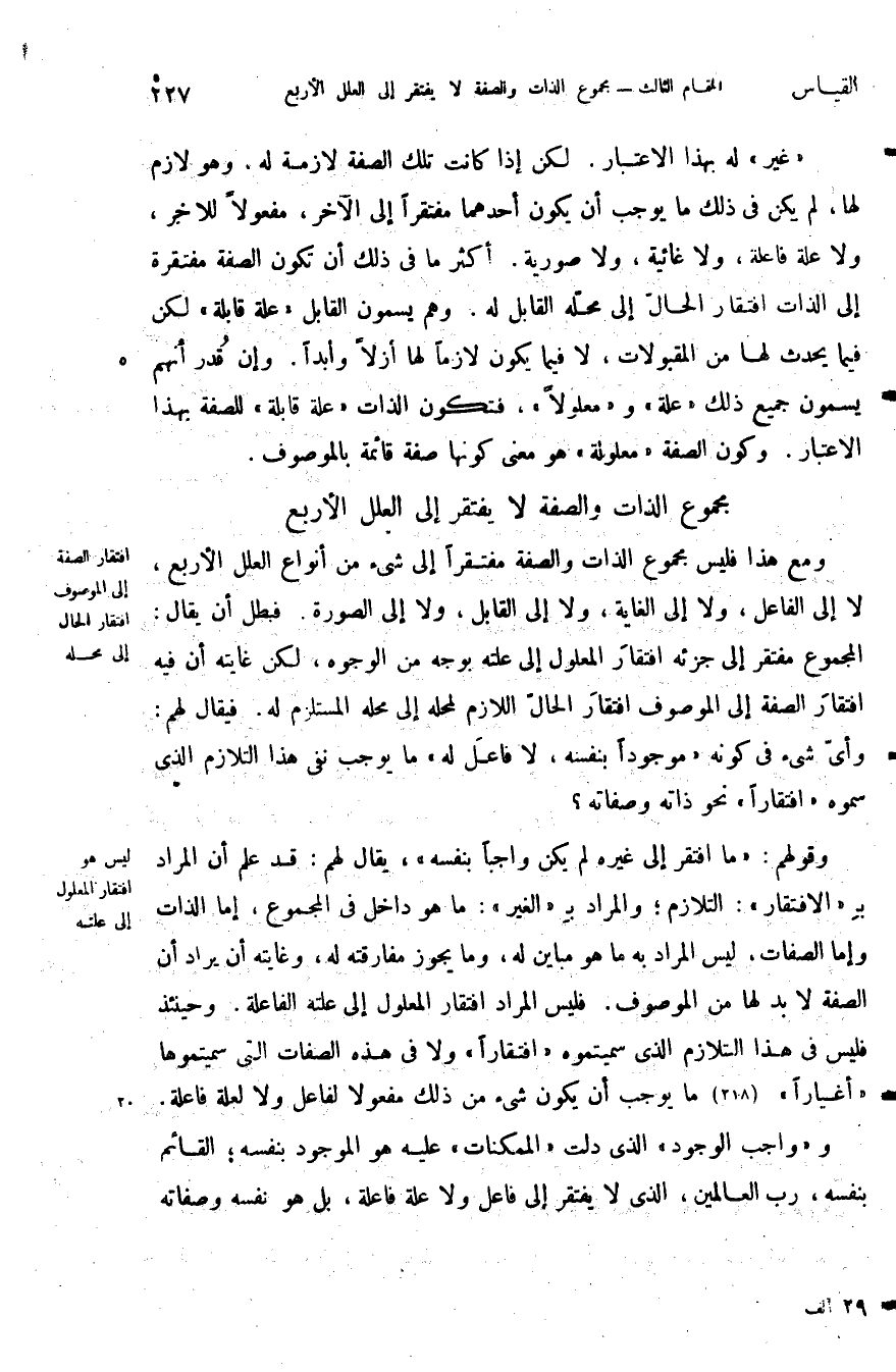 ومع هذا فليس مجموع الذات والصفة مفتقرا إلى شيء من أنواع العلل الأربع لا إلى الفاعل ولا إلى الغاية ولا إلى القابل ولا إلى الصورة فبطل أن يقال المجموع مفتقر إلى جزئه افتقار المعلول إلى علته بوجه من الوجوه لكن غايته أن فيه افتقار الصفة إلى الموصوف افتقار الحال اللازم لمحله إلى محله المستلزم له فيقال لهم وأي شيء في كونه موجودا بنفسه لا فاعل له ما يوجب نفي هذا التلازم الذي سموه افتقار نحو ذاته وصفاته.