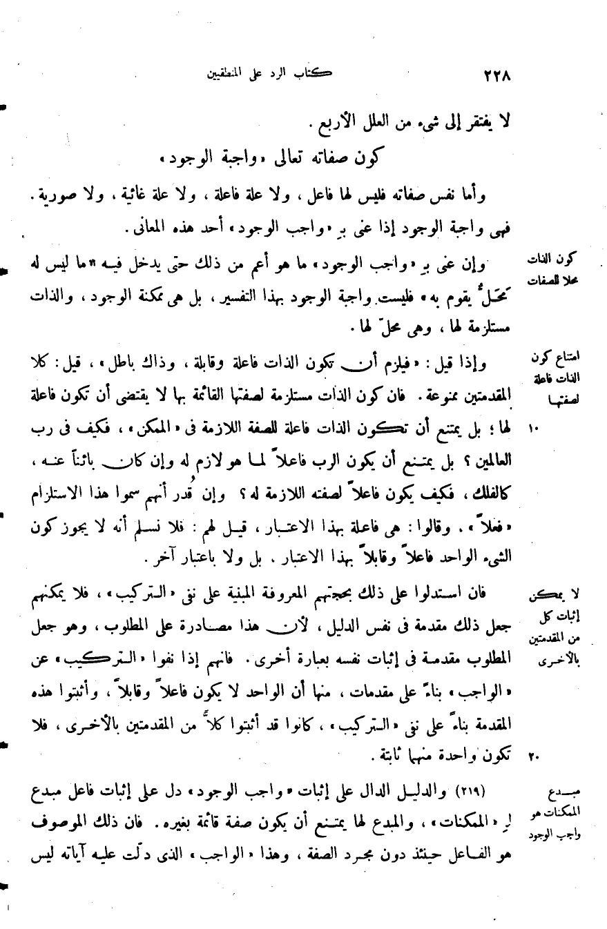 فان استدلوا على ذلك بحجتهم المعروفة المبينة على نفي التركيب فلا يمكنهم جعل ذلك مقدمة في نفس الدليل لأن هذا مصادرة على المطلوب وهو جعل المطلوب مقدمة في إثبات نفسه بعبارة أخرى فإنهم إذا نفوا التركيب عن الواجب بناء على مقدمات منها أن الواحد لا يكون فاعلا وقابلا واثبتوا هذه المقدمة بناء على نفي التركيب كانوا قد اثبتوا كلا من المقدمتين بالأخرى فلا تكون واحدة منهما ثابتة.
