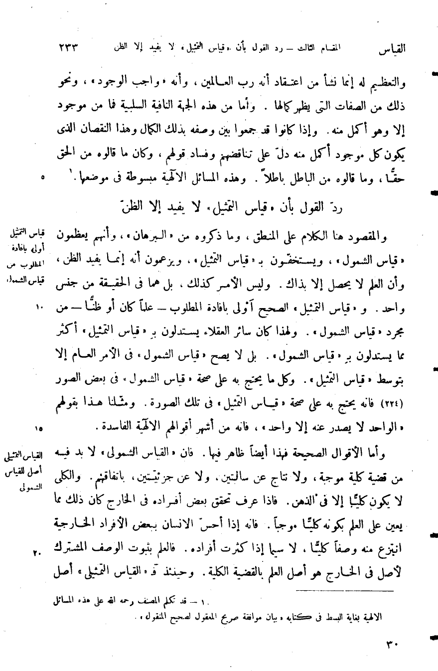 والمقصود هنا الكلام على المنطق وما ذكروه من البرهان وأنهم يعظمون قياس الشمول ويستخفون ب قياس التمثيل ويزعمون أنه إنما يفيد الظن وان العلم لا يحصل إلا بذلك وليس الأمر كذلك بل هما في الحقيقة من جنس واحد وقياس التمثيل الصحيح أولى بإفادة المطلوب علما كان أو ظنا من مجرد قياس الشمول ولهذا كان سائر العقلاء يستدلون ب قياس التمثيل أكثر مما يستدلون ب قياس الشمول بل لا يصح قياس الشمول في الأمر العام إلا بتوسط قياس التمثيل وكل ما يحتج به على صحة قياس الشمول في بعض الصور فانه يحتج به على صحة قياس التمثيل في تلك الصورة ومثلنا هذا بقولهم الواحد لا يصدر عنه إلا واحد فانه من أشهر أقوالهم الإلهية الفاسدة.