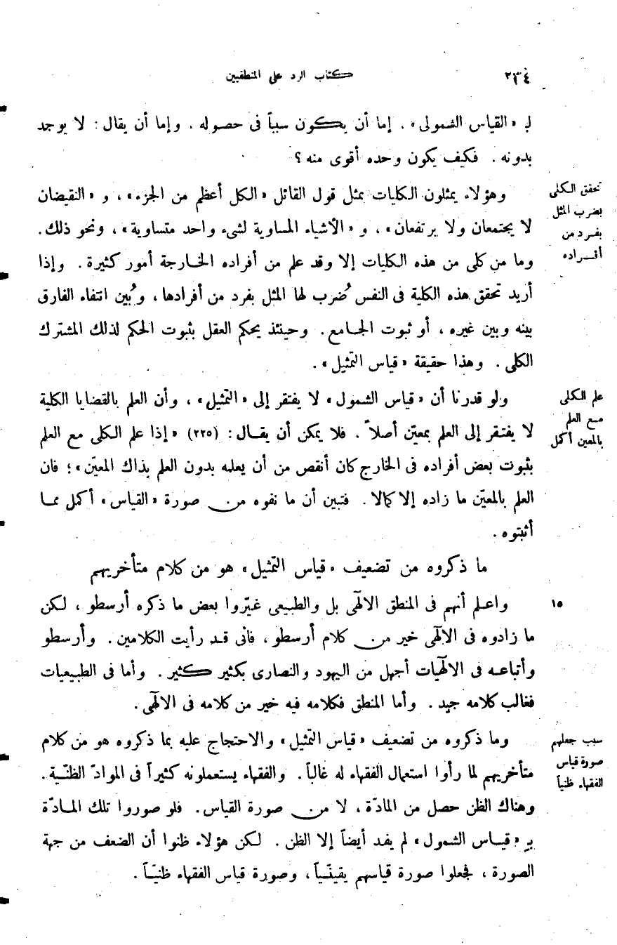 وما ذكروه من تضعيف قياس التمثيل والاحتجاج عليه بما ذكروه هو من كلام متأخريهم لما رأوا استعمال الفقهاء له غالبا والفقهاء يستعملونه كثيرا في المواد الظنية وهناك الظن حصل من المادة لا من صورة القياس فلو صوروا تلك المادة ب قياس الشمول لم يفد أيضا إلا الظن لكن هؤلاء ظنوا أن الضعف من جهة الصورة فجعلوا صورة قياسهم يقينيا وصورة قياس الفقهاء ظنيا.