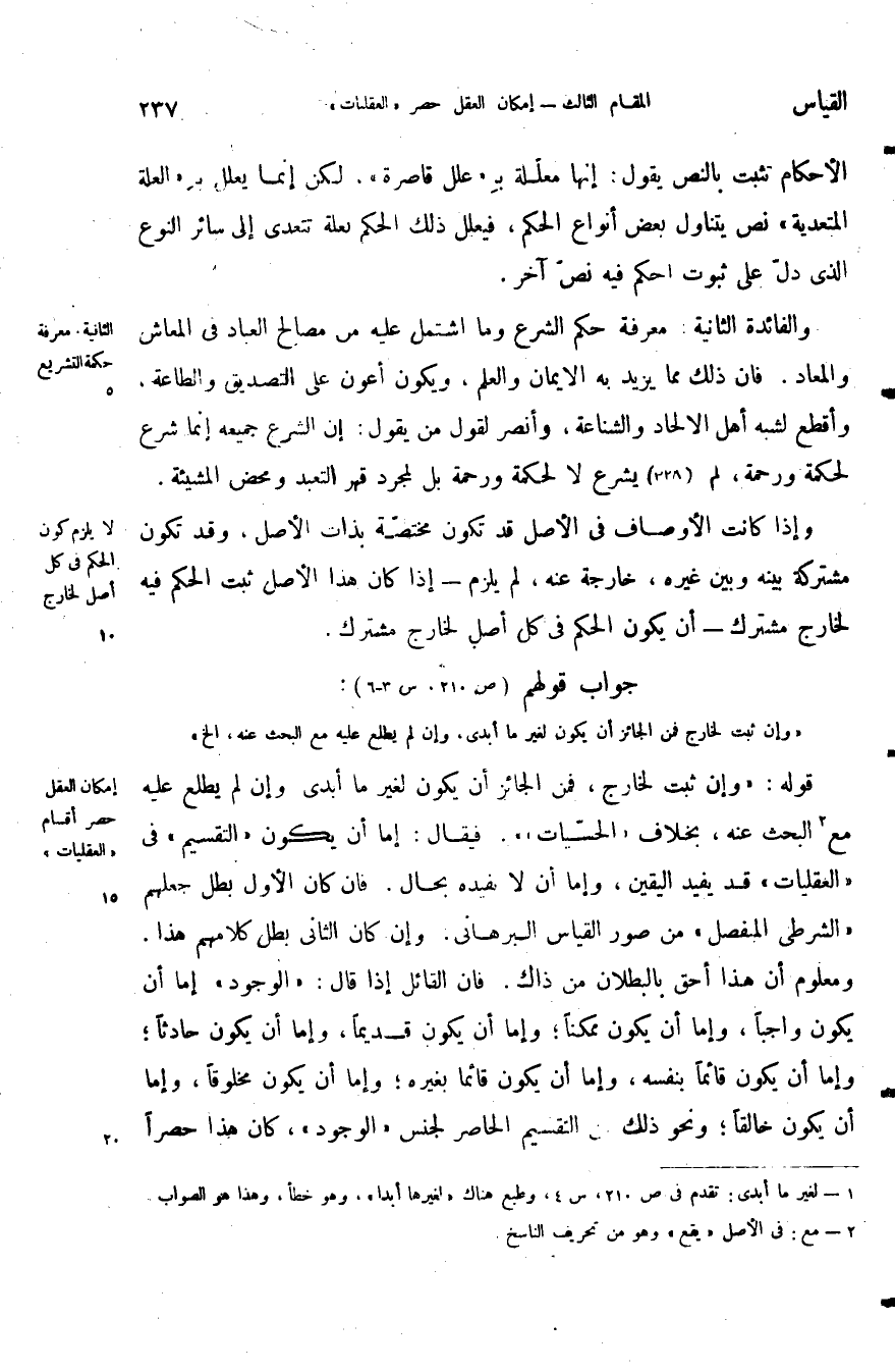 قوله وان ثبت لخارج فمن الجائز أن يكون لغير ما أبدى وان لم يطلع عليه مع البحث عنه بخلاف الحسيات فيقال أما أن يكون التقسيم في العقليات قد يفيد اليقين وأما أن لا يفيده بحال فان كان الأول بطل جعلهم الشرطي المنفصل من صور القياس والبرهان وان كان الثاني بطل كلامهم هذا ومعلوم أن هذا أحق بالبطلان من ذاك فان القائل إذا قال الوجود أما أن يكون واجبا وأما أن يكون ممكنا وأما أن يكون قديما وأما أن يكون حادثا وأما أن يكون قائما بنفسه وأما أن يكون قائما بغيره وأما أن يكون مخلوقا وأما أن يكون خالقا ونحو ذلك من التقسيم الحاصر لجنس الوجود كان هذا حصرا