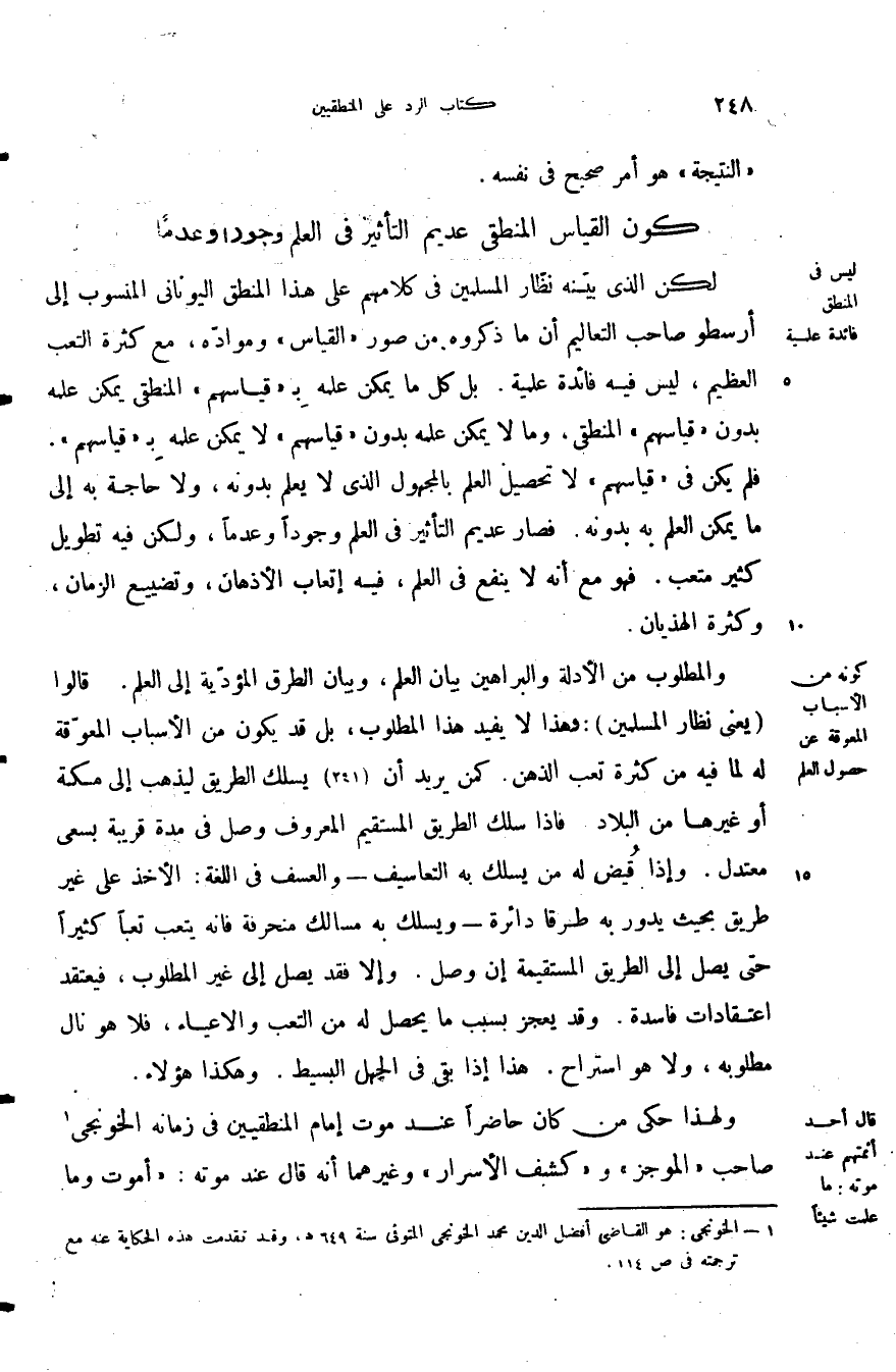 لكن الذي بينه نظار المسلمين في كلامهم على هذا المنطق اليوناني المنسوب إلى أرسطو صاحب التعاليم أن ما ذكروه من صور القياس ومواده مع كثرة التعب العظيم ليس فيه فائدة علمية بل كل ما يمكن علمه ب قياسهم المنطقي يمكن علمه بدون قياسهم المنطقي وما لا يمكن علمه بدون قياسهم لا يمكن علمه ب قياسهم فلم يكن في قياسهم لا تحصيل العلم بالمجهول الذي لا يعلم بدونه ولا حاجة به إلى ما يمكن العلم به بدونه فصار عديم التأثير في العلم وجودا وعدما ولكن فيه تطويل كثير متعب فهو مع أنه لا ينفع في العلم فيه إتعاب الأذهان وتصنييع الزمان وكثرة الهذيان.