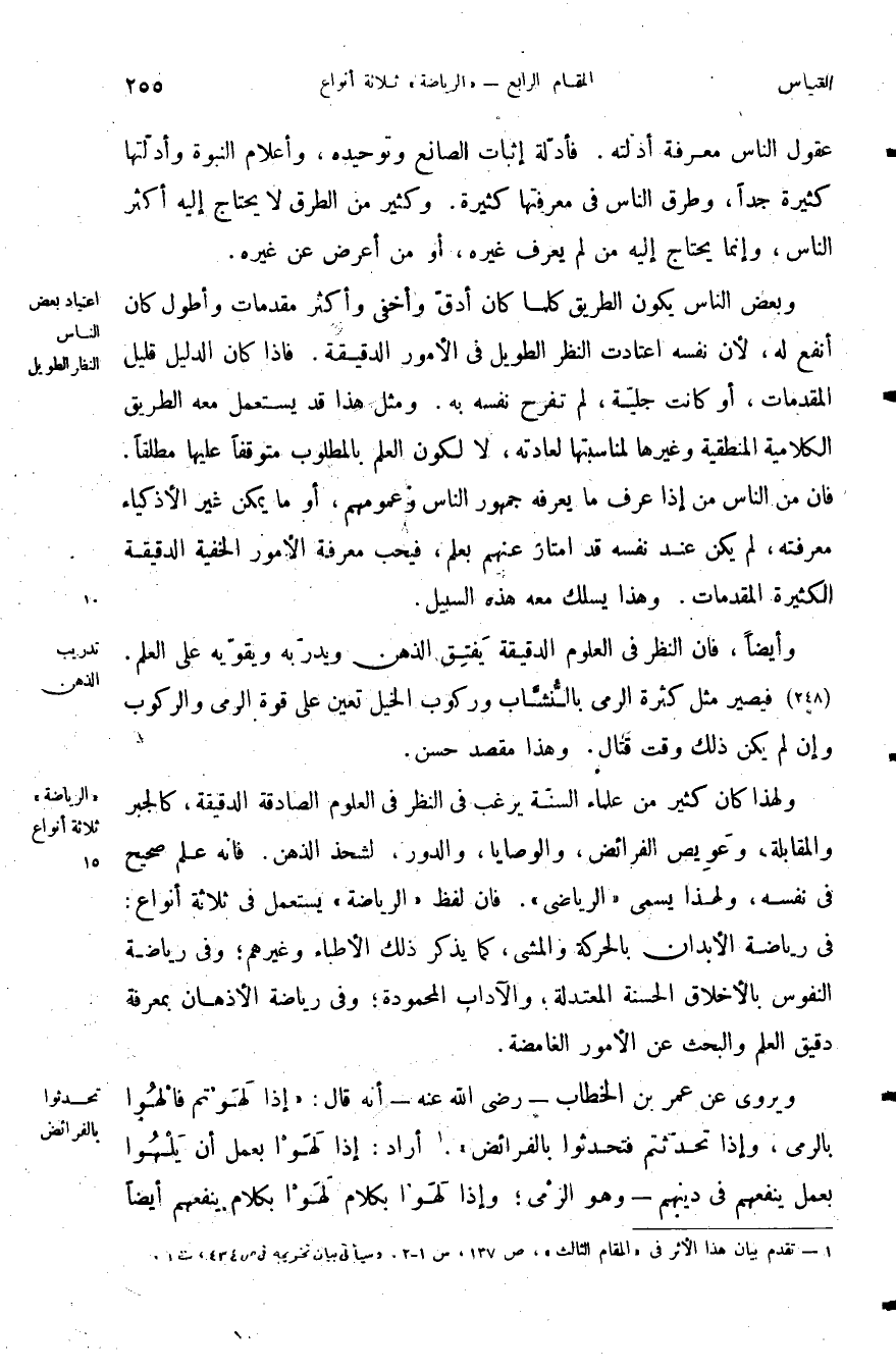 ولهذا كان كثير من علماء السنة يرغب في النظر في العلوم الصادقة الدقيقة كالجبر والمقابلة وعويص الفرائض والوصايا والدور لشحذ الذهن فانه علم صحيح في نفسه ولهذا يسمى الرياضي فان لفظ الرياضة يستعمل في ثلاثة أنواع في رياضة الأبدان بالحركة والمشي كما يذكر ذلك الأطباء وغيرهم وفي رياضة النفوس بالأخلاق الحسنة المعتدلة والآداب المحمودة وفي رياضة الأذهان بمعرفة دقيق العلم والبحث عن الأمور الغامضة.