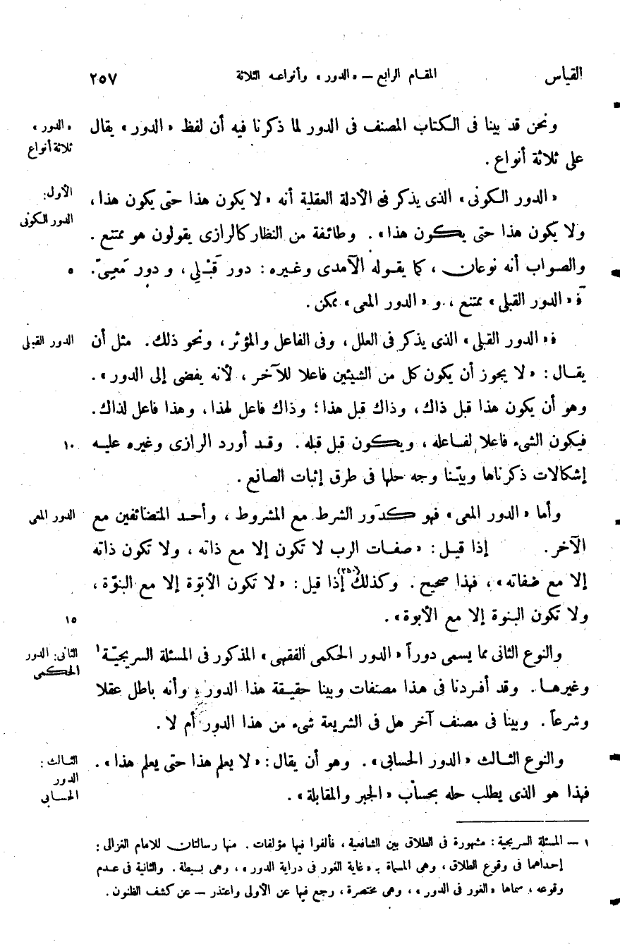 والنوع الثالث: الدور الحسابي وهو أن يقال لا يعلم هذا حتى يعلم هذا فهذا هو الذي يطلب حله بحساب الجبر والمقابلة