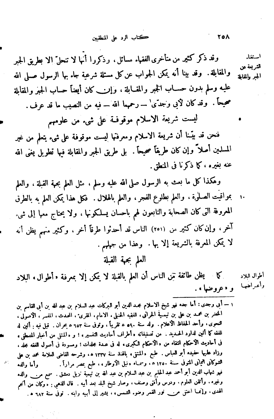 وقد ذكر كثير من متأخري الفقهاء مسائل وذكروا أنها لا تنحل إلا بطريق الجبر والمقابلة وقد بينا أنه يمكن الجواب عن كل مسألة شرعية جاء بها الرسول صلى الله عليه وسلم بدون حساب الجبر والمقابلة وإن كان أيضا حساب الجبر والمقابلة صحيحا وقد كان لأبي وجدي رحمهما الله فيه من النصيب ما قد عرف.