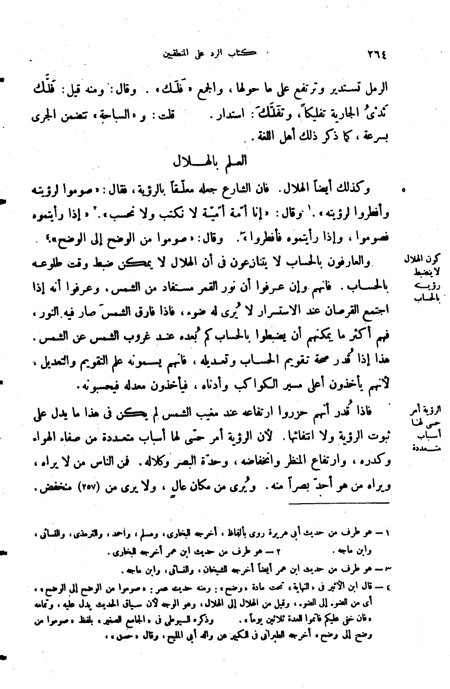 وكذلك أيضا الهلال فان الشارع جعله معلقا بالرؤية فقال: "صوموا لرؤيته وأفطروا لرؤيته" وقال: "إنا أمة أمية لا نكتب ولا نحسب إذا رأيتموه فصوموا وإذا رأيتموه فأفطروا" وقال: "صوموا من الوضح إلى الوضح ".