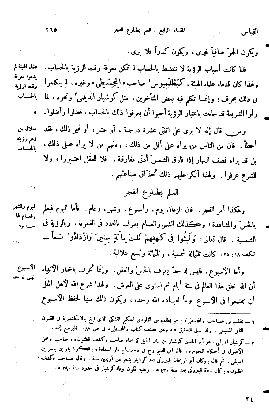 وهكذا أمر الفجر فان الزمان يوم وأسبوع وشهر وعام فأما اليوم فيعلم بالحس والمشاهدة وكذلك الشهر والعام يعرف بالعدد في القمرية وبالرؤية في الشمسية قال تعالى: {وَلَبِثُوا فِي كَهْفِهِمْ ثَلاثَ مِائَةٍ سِنِينَ وَازْدَادُوا تِسْعاً} كانت ثلثمائة شمسية وثلثمائة وتسع هلالية.