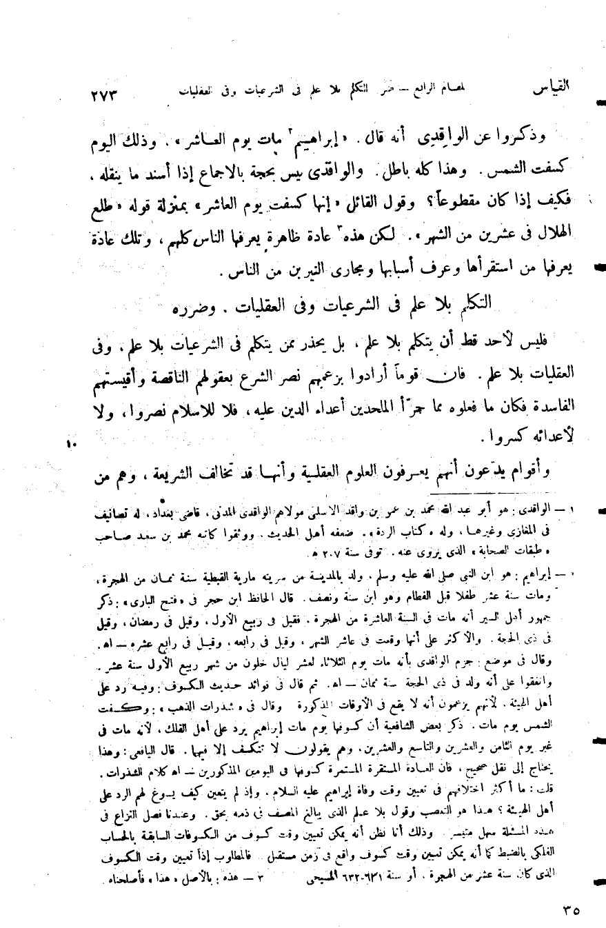وذكروا عن الواقدي أنه قال: "إبراهيم مات يوم العاشر وذلك اليوم كسفت الشمس" وهذا كله باطل والواقدي ليس بحجة بالإجماع إذا اسند ما ينقله فكيف إذا كان مقطوعا وقول القائل أنها كسفت يوم العاشر بمنزلة قوله طلع الهلال في عشرين من الشهر لكن هذه عادة ظاهرة يعرفها الناس كلهم وتلك عادة يعرفها من استقراها وعرف أسبابها ومجاري النيرين من الناس.