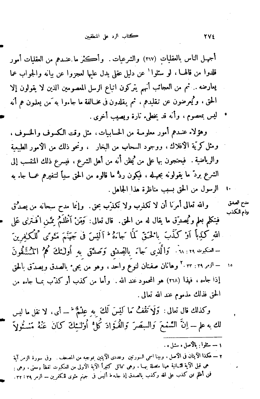 وهؤلاء عندهم أمور معلومة من الحسابيات مثل وقت الكسوف والخسوف ومثل كرية الأفلاك ووجود السحاب من البخاري ونحو ذلك من الأمور الطبيعية والرياضية فيحتجون بها على من يظن أنه من أهل الشرع فيسرع ذلك المنتسب إلى الشرع برد ما يقولونه بجهله فيكون رد ما قالوه من الحق سببا لتنفيرهم عما جاء به الرسول من الحق بسبب مناظرة هذا الجاهل.