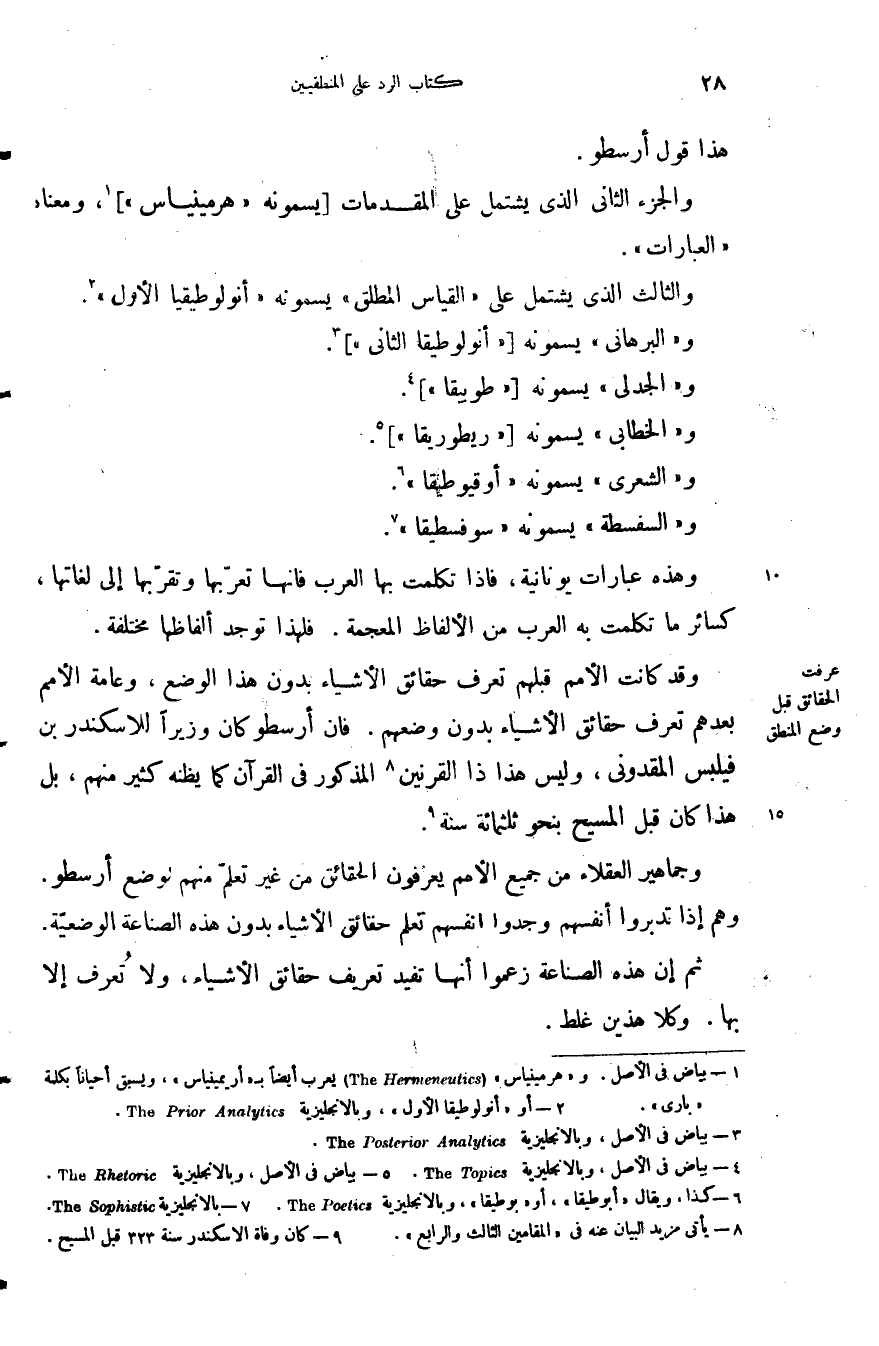 وجماهير العقلاء من جميع الأمم يعرفون الحقائق من غير تعلم منهم بوضع أرسطو وهم إذا تدبروا أنفسهم وجدوا أنفسهم تعلم حقائق الأشياء بدون هذه الصناعة الوضعية.