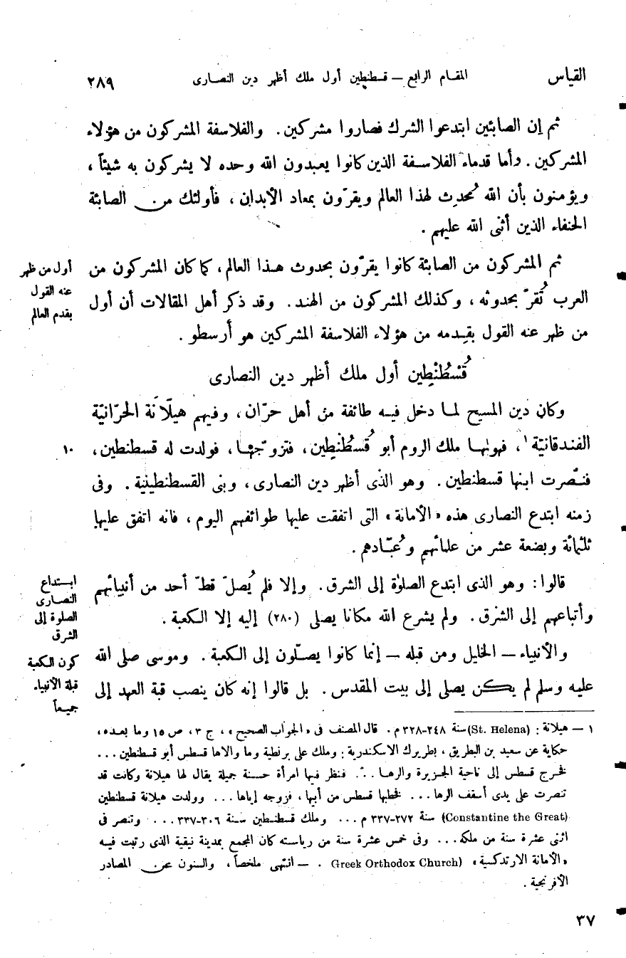 وكان دين المسيح لما دخل فيه طائفة من أهل حران وفيهم هيلانة الحرانية الفندقانية فهولها ملك الروم أبو قسطنطين فتزوجها فولدت له قسطنطين فنصرت ابنها قسطنطين وهو الذي اظهر دين النصارى وبنى القسطنطينية وفي زمنه ابتدع النصارى هذه الامانة التي اتفقت عليها طوائفهم اليوم فانه اتفق عليها ثلثمائة وبضعة عشرة من علمائهم وعبادهم.