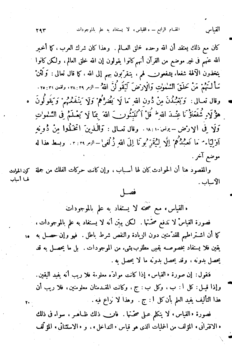 فصورة القياس لا يدفع صحتها لكن يبين أنه لا يستفاد به علم بالموجودات كما أن اشتراطهم للمقدمتين دون الزيادة والنقص شرط باطل فهو وإن حصل به يقين فلا يستفاد بخصوصه نفس مطلوب شيء من الموجودات بل ما يحصل به قد يحصل بدونه وقد يحصل بدونه ما لا يحصل به.