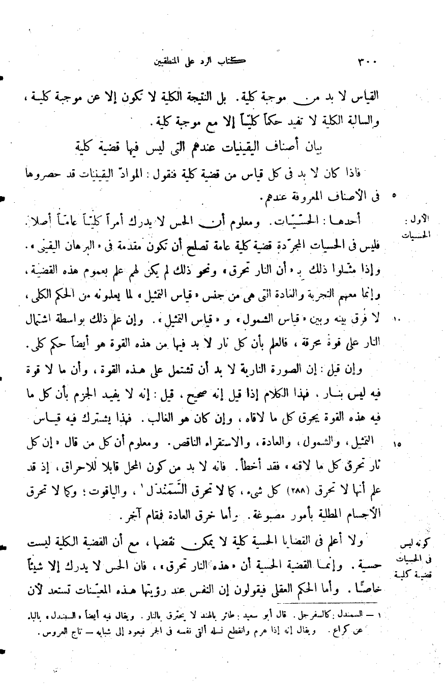 أحدها: الحسيات ومعلوم أن الحس لا يدرك أمرا كليا عاما أصلا فليس في الحسيات المجردة قضية كلية عامة تصلح أن تكون مقدمة في البرهان اليقيني وإذا مثلوا ذلك ب أن النار تحرق ونحو ذلك لم يكن لهم علم بعموم هذه القضية وإنما معهم التجربة والعادة التي هي من جنس قياس التمثيل لما يعلمونه من الحكم الكلى لا فرق بينه وبين قياس الشمول وقياس التمثيل وإن علم ذلك بواسطة اشتمال النار على قوة محرقة فالعلم بأن كل نار لا بد فيها من هذه القوة هو أيضا حكم كلى.