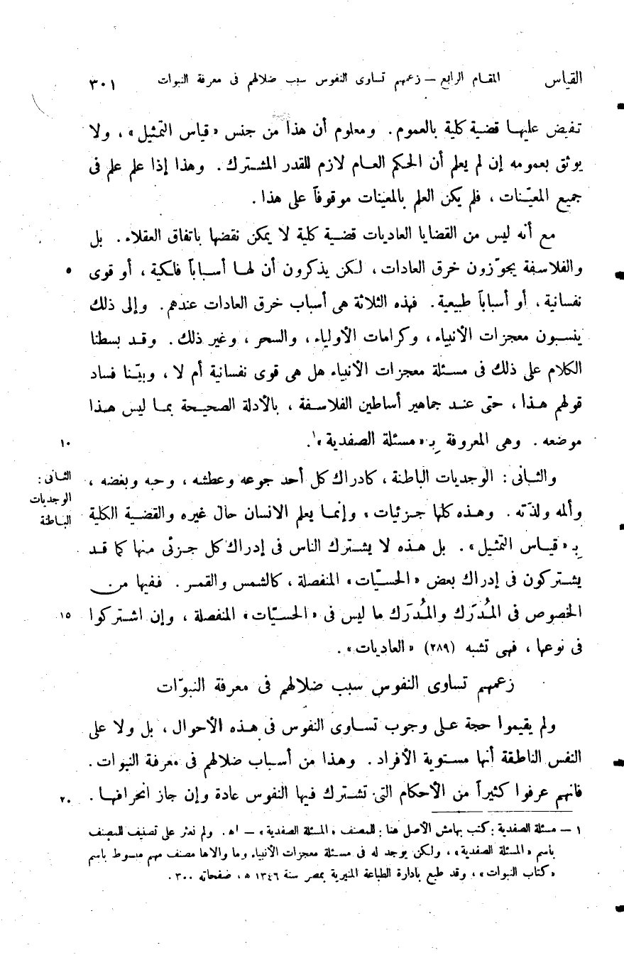 والثاني: الوجديات الباطنة كادراك كل احد جوعه وعطشه وحبه وبغضه وألمه ولذته وهذه كلها جزئيات وإنما يعلم الإنسان حال غيره والقضية الكلية ب قياس التمثيل بل هذه لا يشترك الناس في إدراك كل جزئي منها كما قد يشتركون في إدراك بعض الحسيات المنفصلة كالشمس والقمر ففيها من الخصوص في المدرك والمدرك ما ليس في الحسيات المنفصلة وإن اشتركوا في نوعها فهي تشبه العاديات.