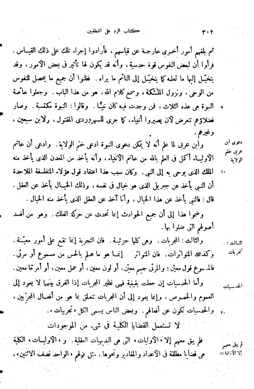والثالث: المجريات وهي كلها جزئية فان التجربة إنما تقع على أمور معينة وكذلك المتواترات فان المتواترات إنما هو ما علم بالحس من مسموع أو مرئي فالمسموع قول معين والمرئي جسم معين أو لون معين أو عمل معين أو أمر ما معين.