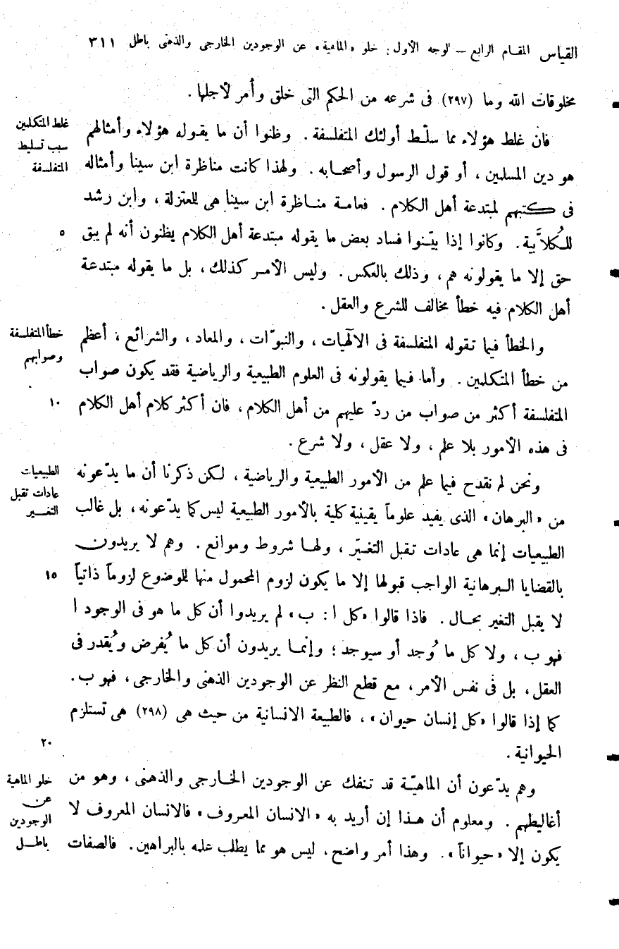 فان غلط هؤلاء مما سلط أولئك المتفلسفة وظنوا أن ما يقول هؤلاء وأمثالهم هو دين المسلمين أو قول الرسول وأصحابه ولهذا كانت مناظرة ابن سينا وأمثاله في كتبهم لمبتدعة أهل الكلام فعامة مناظرة ابن سينا هي للمعتزلة وابن رشد للكلابية وكانوا إذا بينوا فساد بعض ما يقوله مبتدعة أهل الكلام يظنون أنه لم يبق حق إلا ما يقولونه هم وذلك بالعكس وليس الأمر كذلك بل ما يقوله مبتدعة أهل الكلام فيه خطأ مخالف للشرع والعقل.