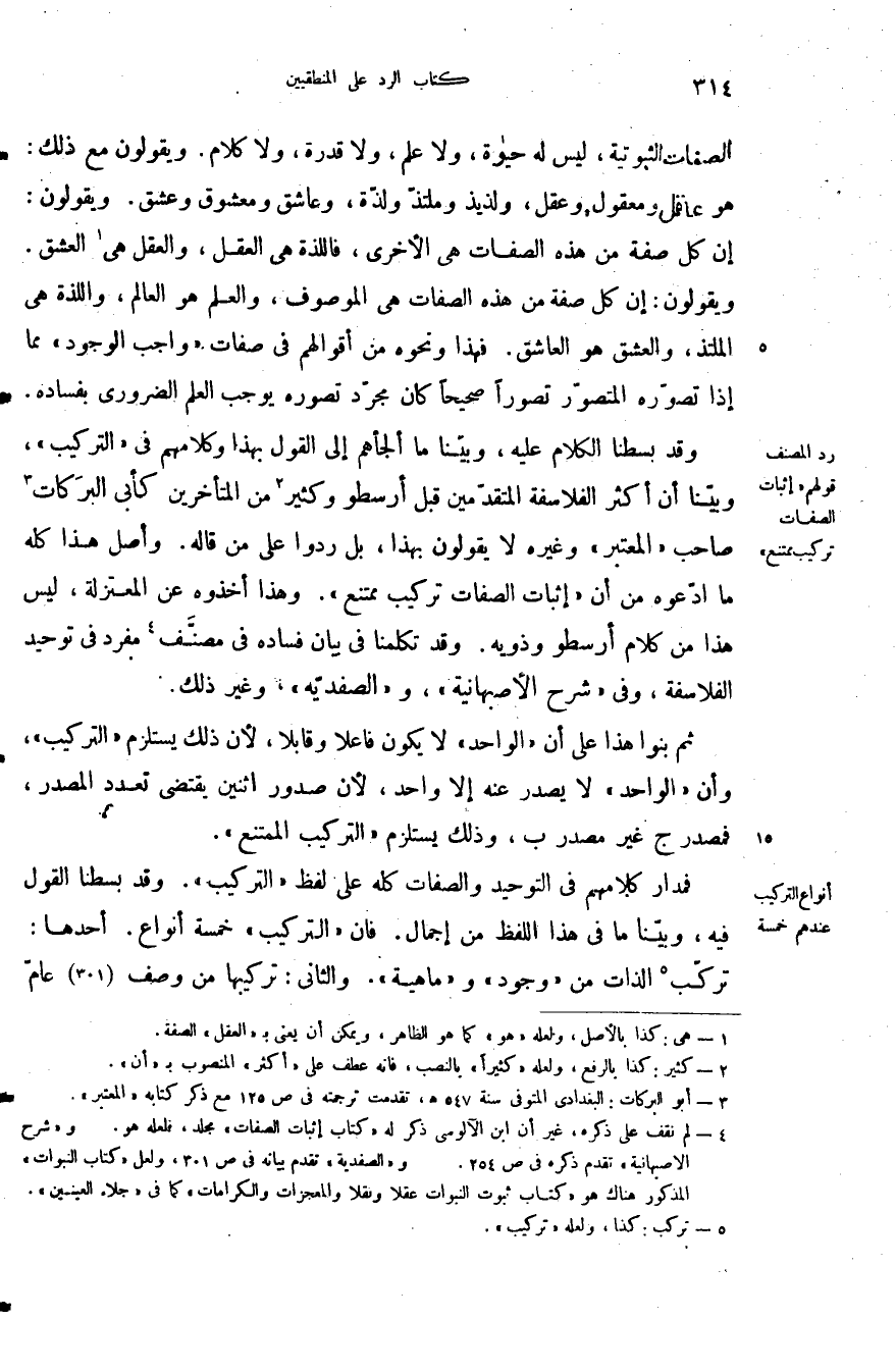 وقد بسطنا الكلام عليه وبينا ما ألجأهم إلى القول بهذا وكلامهم في التركيب وبينا أن أكثر الفلاسفة المتقدمين قبل أرسطو وكثير من المتأخرين كأبي البركات صاحب المعتبر وغيره لا يقولون بهذا بل ردوا على من قاله واصل هذا كله ما ادعوه من أن إثبات الصفات تركيب ممتنع وهذا أخذوه عن المعتزلة ليس هذا من كلام أرسطو وذويه وقد تكلمنا في بيان فساده في مصنف مفرد في توحيد الفلاسفة وفي شرح الاصبهانية والصفدية وغير ذلك.