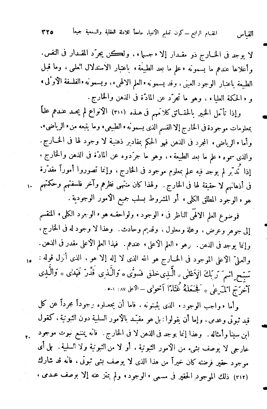 فموضوع العلم الالهى الناظر في الوجود ولواحقه هو الوجود الكلى المنقسم إلى جوهر وعرض وعلة ومعلول وقديم وحادث وهذا لا وجود له في الخارج وإنما يوجد في الذهن وهو العلم الأعلى عندهم فهذا العلم الأعلى مقدر في الذهن والعلى الأعلى الموجود في الخارج هو الله الذي لا إله إلا هو الذي أنزل قوله: {سَبِّحِ اسْمَ رَبِّكَ الأَعْلَى الَّذِي خَلَقَ فَسَوَّى وَالَّذِي قَدَّرَ فَهَدَى وَالَّذِي أَخْرَجَ الْمَرْعَى فَجَعَلَهُ غُثَاءً أَحْوَى} .
