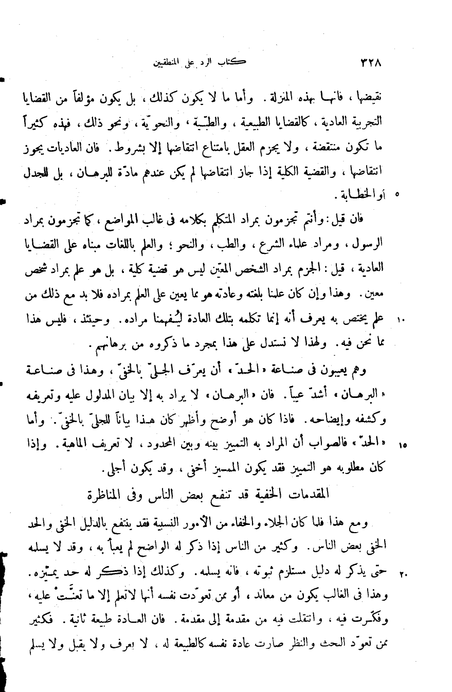 وهم يعيبون في صناعة الحد أن يعرف الجلى بالخفي وهذا في صناعة البرهان اشد عيبا فان البرهان لا يراد به إلا به إلا بيان المدلول عليه وتعريفه وكشفه وأيضاحه فإذا كان هو أوضح وأظهر كان هذا بيانا للجلى بالخفي وأما الحد فالصواب أن المراد به التمييز بينه وبين المحدود لا تعريف الماهية وإذا كان مطلوبه هو التمييز فقد يكون المميز اخفى وقد يكون أجلى.
