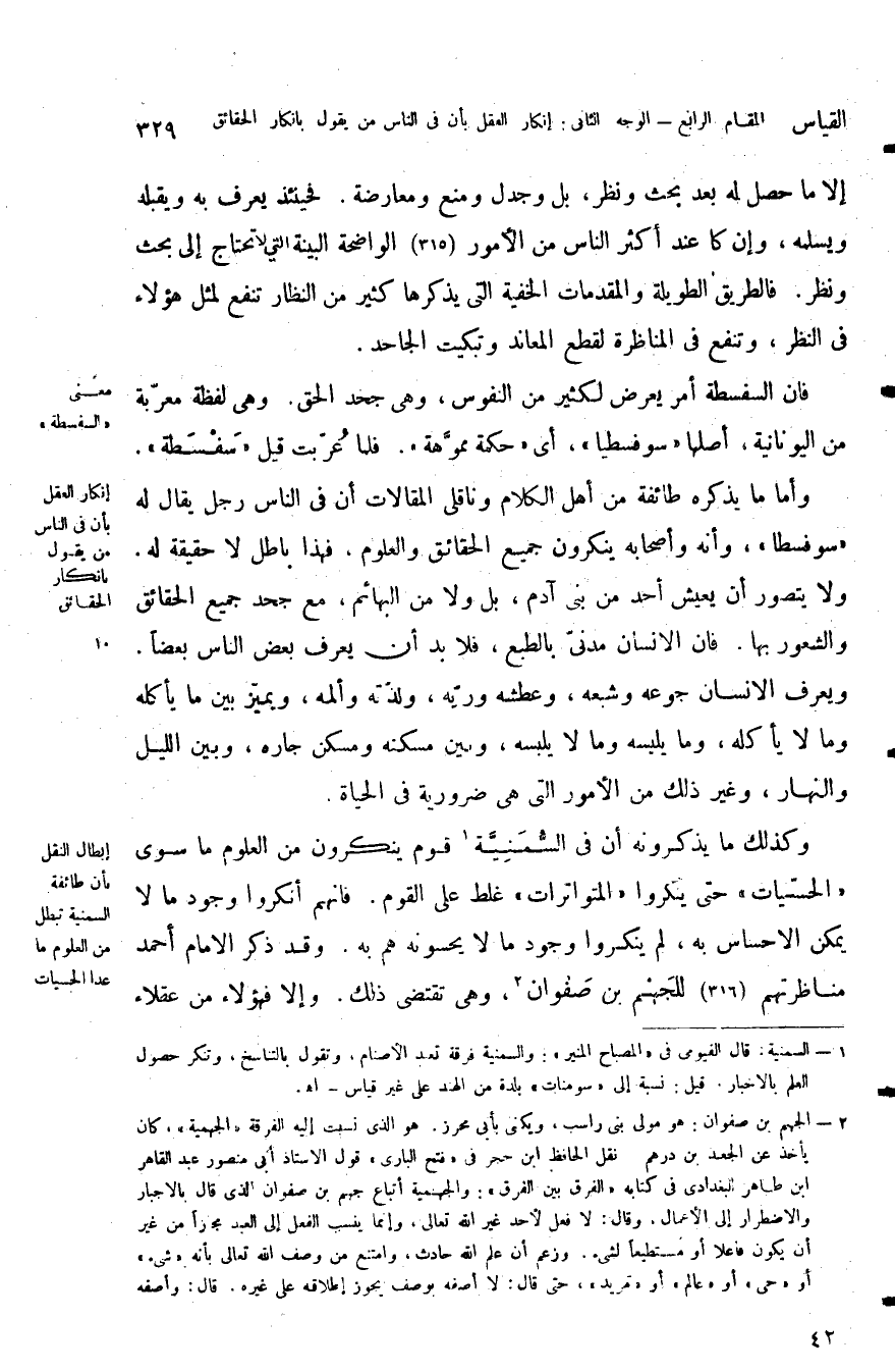 وكذلك ما يذكرونه أن في السمنية قوم ينكرون من العلوم ما سوى الحسيات حتى ينكروا المتواترات غلط على القوم فإنهم انكروا وجود ما لا يمكن الاحساس به لم ينكروا وجود ما لا يحسونه مم به وقد ذكر الامام احمد مناظرتهم للجهم بن صفوان وهي تقتضى ذلك وإلا فهؤلاء من عقلاء
