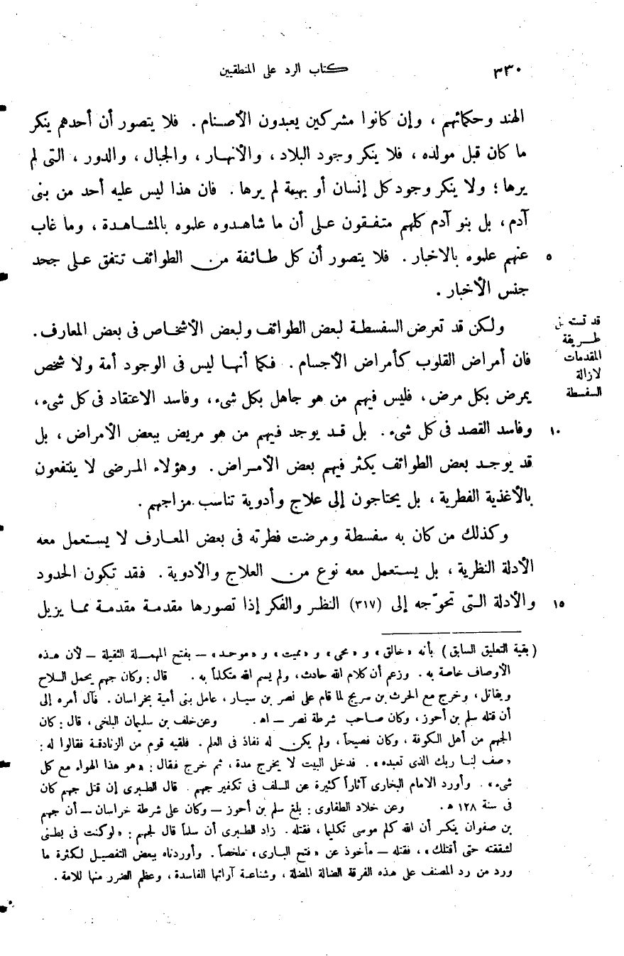 ولكن قد تعرض السفسطة لبعض الطوائف ولبعض الأشخاص في بعض المعارف فان أمراض القلوب كأمراض الأجسام فكما أنها ليس في الوجود أمة ولا شخص يمرض بكل مرض فليس فيهم من هو جاهل بكل شيء وفاسد الاعتقاد في كل شيء وفاسد القصد في كل شيء بل قد يوجد فيهم من هو مريض ببعض الامراض بل قد يوجد بعض الطوائف يكثر فيهم بعض الامراض وهؤلاء المرضى لا ينتفعون بالاغذية الفطرية بل يحتاجون إلى علاج وادوية تناسب مزاجهم.