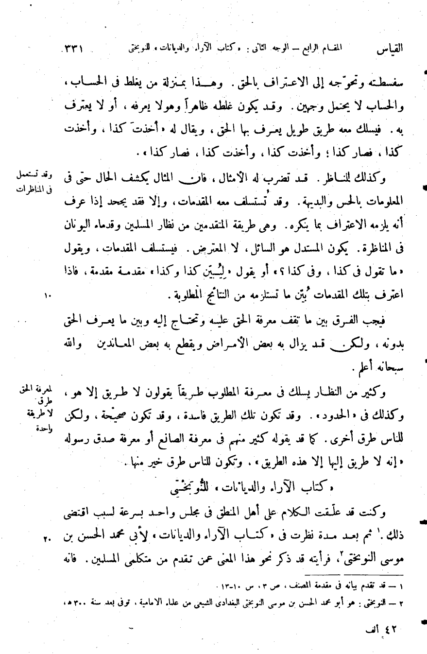وكنت قد علقت الكلام على أهل المنطق في مجلس واحد بسرعة لسبب اقتضى ذلك ثم بعد مدة نظرت في كتاب الآراء والديانات لأبي محمد الحسن بن موسى النوبختى فرأيته قد ذكر نحو هذا المعنى عمن تقدم من متكلمى المسلمين فانه