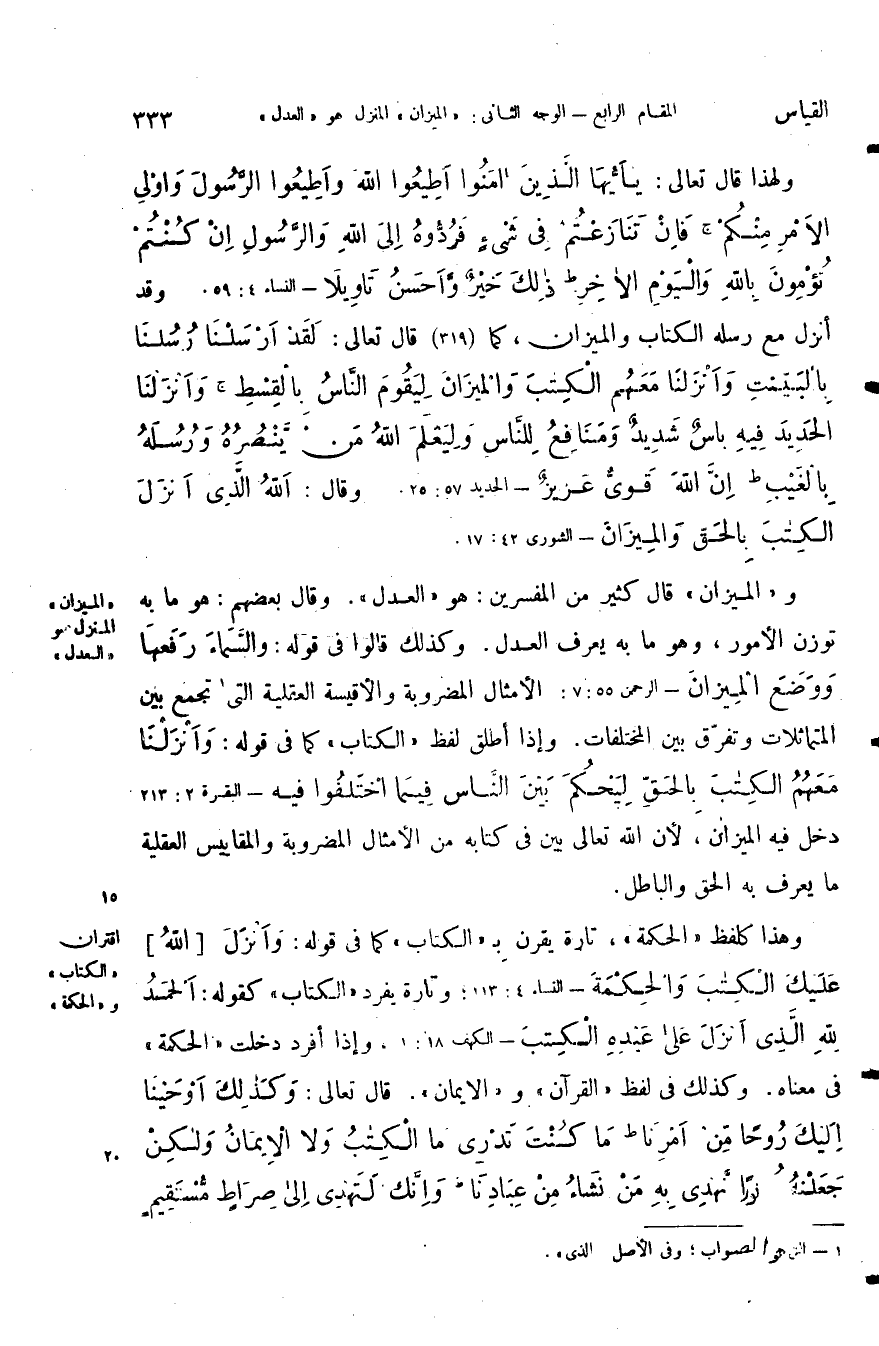 والميزان قال كثير من المفسرين: "هو العدل" وقال بعضهم: "هو ما به توزن الأمور وهو ما به يعرف العدل" وكذلك قالوا في قوله: {وَالسَّمَاءَ رَفَعَهَا وَوَضَعَ الْمِيزَانَ} الامثال المضروبة والأقيسة العقلية التي تجمع بين المتماثلات وتفرق بين المختلفات وإذا أطلق لفظ الكتاب كما في قوله: {وَأَنْزَلَ مَعَهُمُ الْكِتَابَ بِالْحَقِّ لِيَحْكُمَ بَيْنَ النَّاسِ فِيمَا اخْتَلَفُوا فِيهِ} دخل فيه الميزان لأن الله تعالى بين في كتابه من الامثال المضروبة والمقاييس العقلية ما يعرف به الحق والباطل.