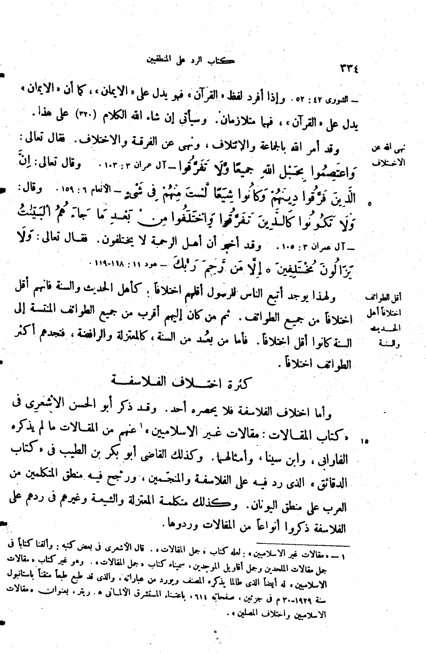 وأما اختلاف الفلاسفة فلا يحصره احد وقد ذكر أبو الحسن الأشعري في كتاب المقالات مقالات غير الإسلاميين عنهم من المقالات ما لم يذكره الفارابي وابن سينا وأمثالهما وكذلك القاضي أبو بكر بن الطيب في كتاب الدقائق الذي رد فيه على الفلاسفة والمنجدمين ورجح فيه منطق المتكلمين من العرب على منطق اليونان وكذلك متكلمة المعتزلة والشيعة وغيرهم في ردهم على الفلاسفة ذكروا أنواعا من المقالات وردوها