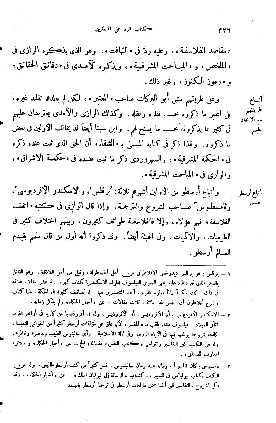 واتباع أرسطو من الأولين اشهرهم ثلاثة برقلس والاسكندر الافرديوسي وثامسطيوس صاحب الشروح والترجمة وإذا قال الرازي في كتبه: "اتفقت الفلاسفة" فهم هؤلاء وإلا فالفلاسفة طوائف كثيرون وبينهم اختلاف كثير في الطبيعيات والإلهيات وفي الهيئة أيضا وقد ذكروا أنه أول من قال منهم بقدم العالم أرسطو